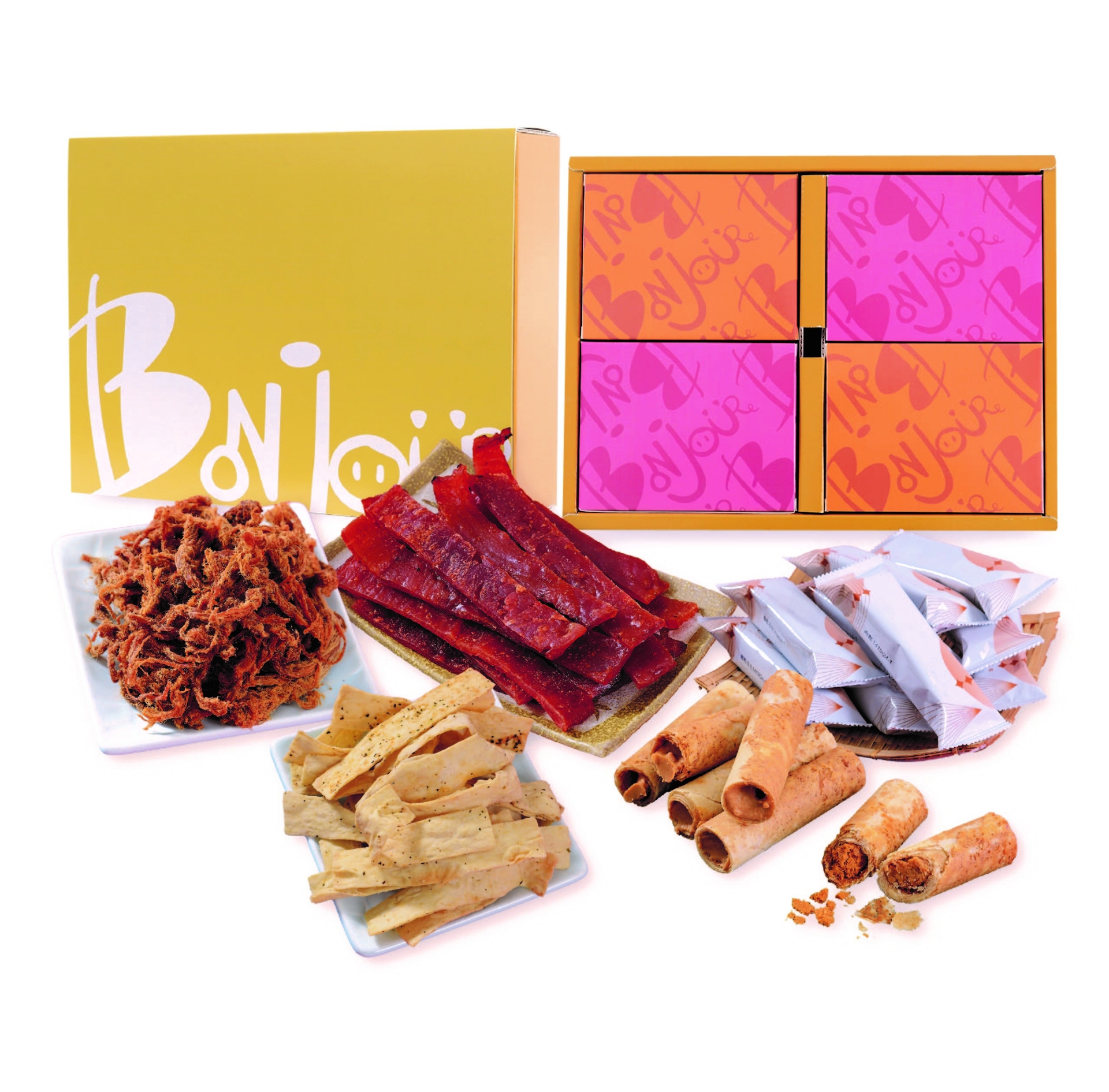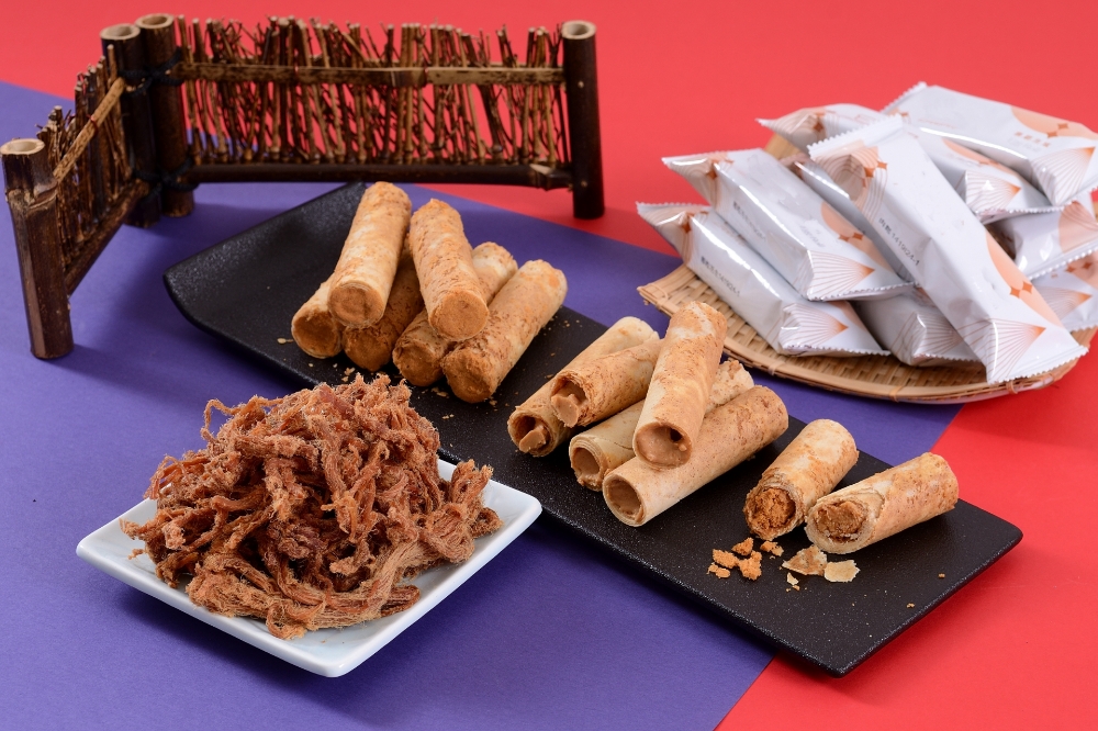 手工肉撕絲150g+炙燒原味肉條150g+鱈魚塔香風味切片120g+滿餡肉鬆蛋捲18g*5支