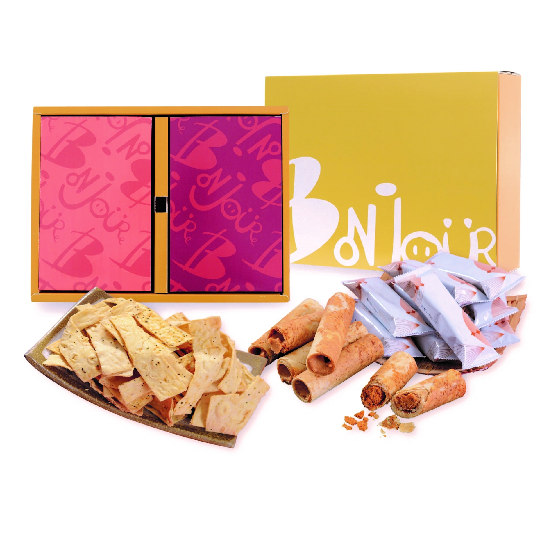 滿餡肉鬆蛋捲18g*5支+滿餡花生蛋捲18g*5支+鱈魚塔香風味切片120g