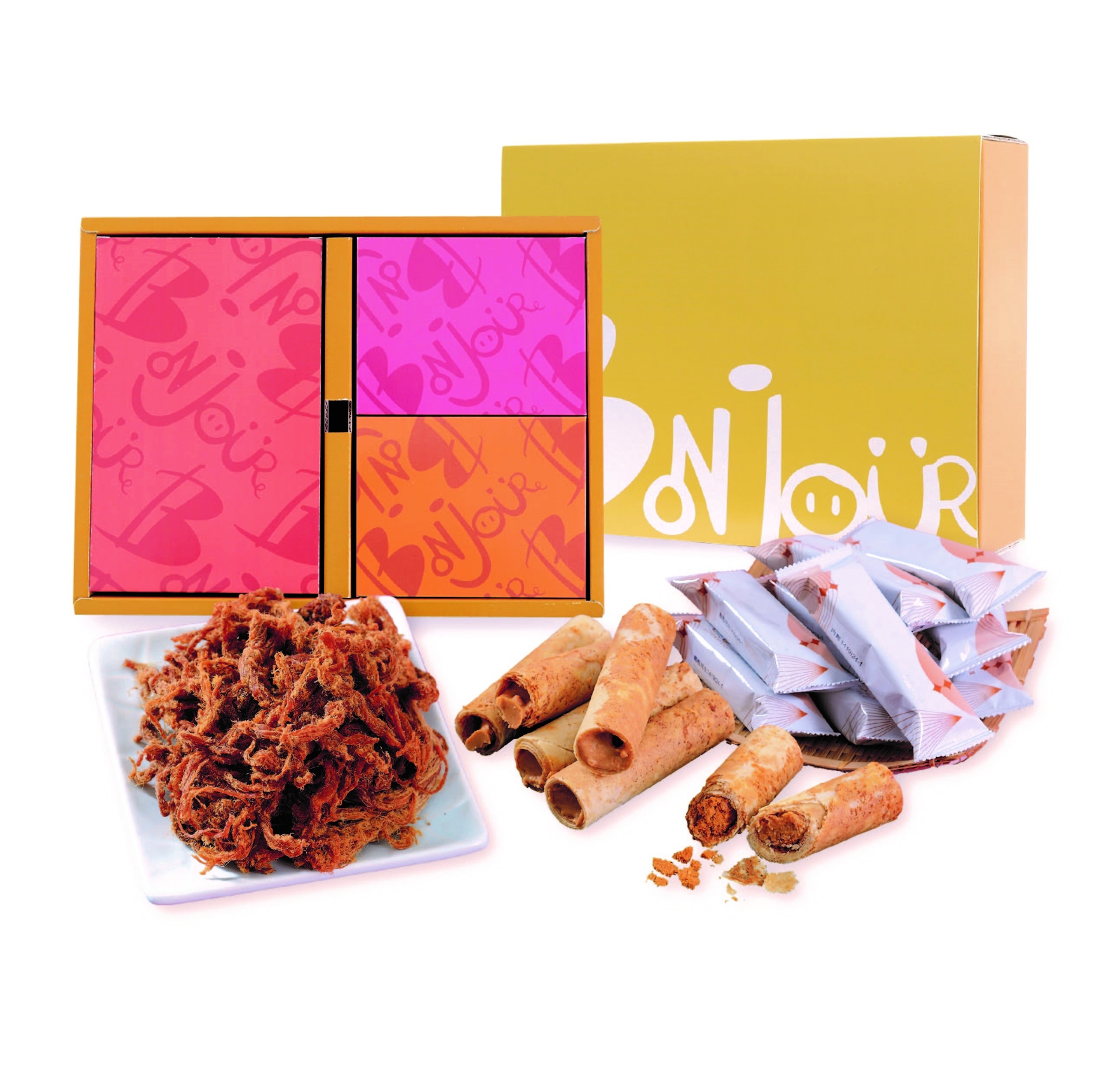 手工肉撕絲150g+滿餡花生蛋捲18g*5支+滿餡肉鬆蛋捲18g*5支