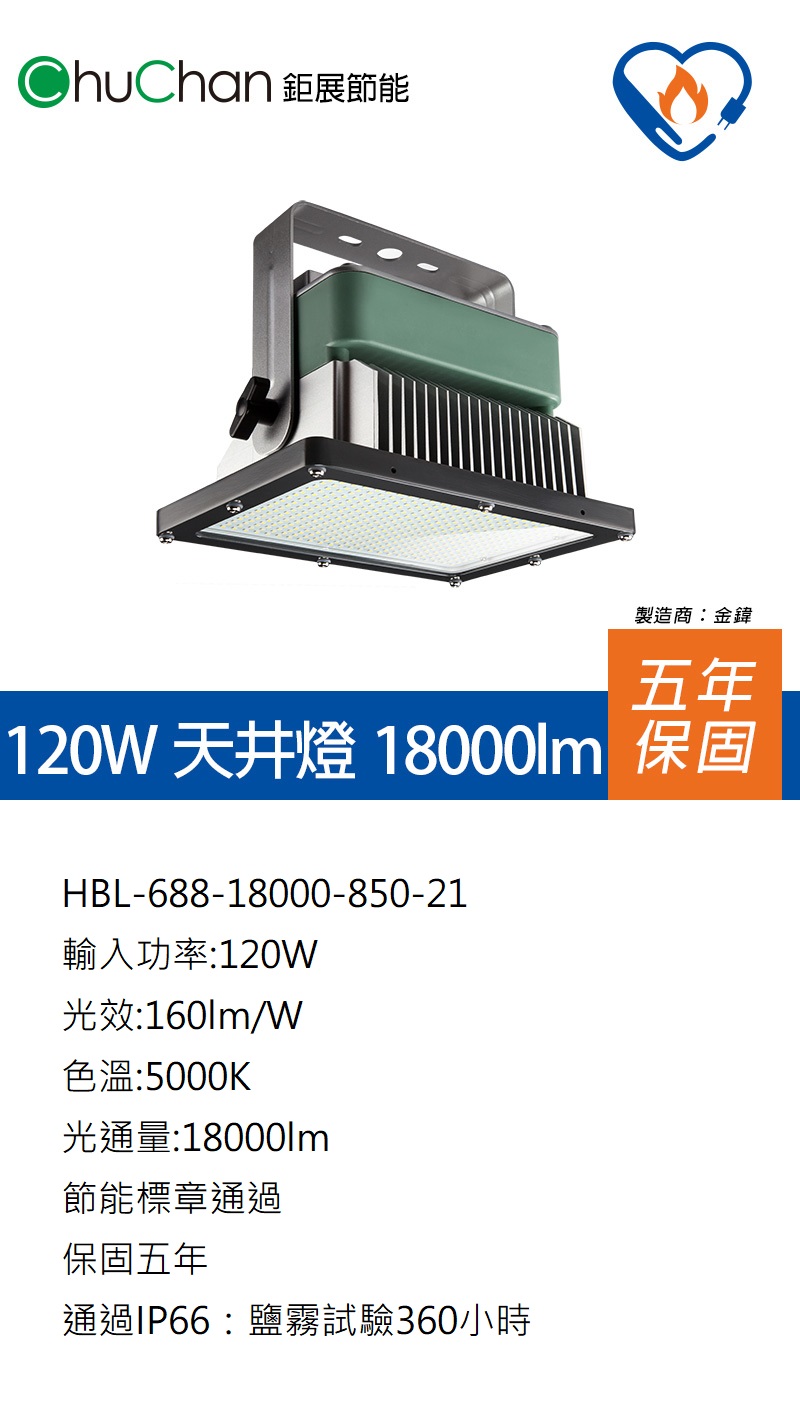 HBL-688-18000-850-21、輸入功率:120W、光效:160lm/W、色溫:5000K、光通量:18000lm、節能標章通過、保固五年、通過IP66::鹽霧試驗360小時