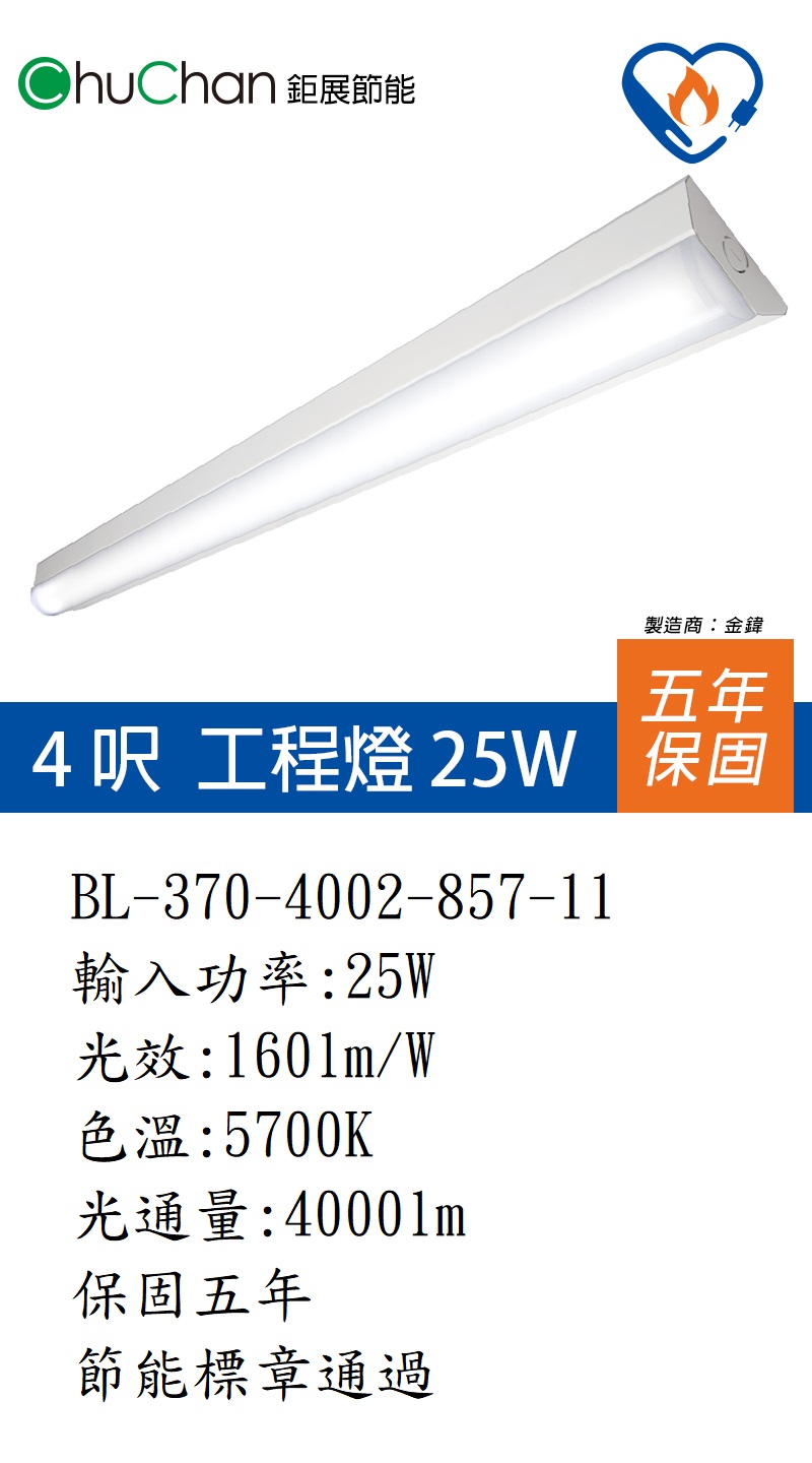 BL-370-4002-857-11、輸入功率:25W、光效:160lm/W、色溫:5700K、光通量:4000lm、保固五年、節能標章通過