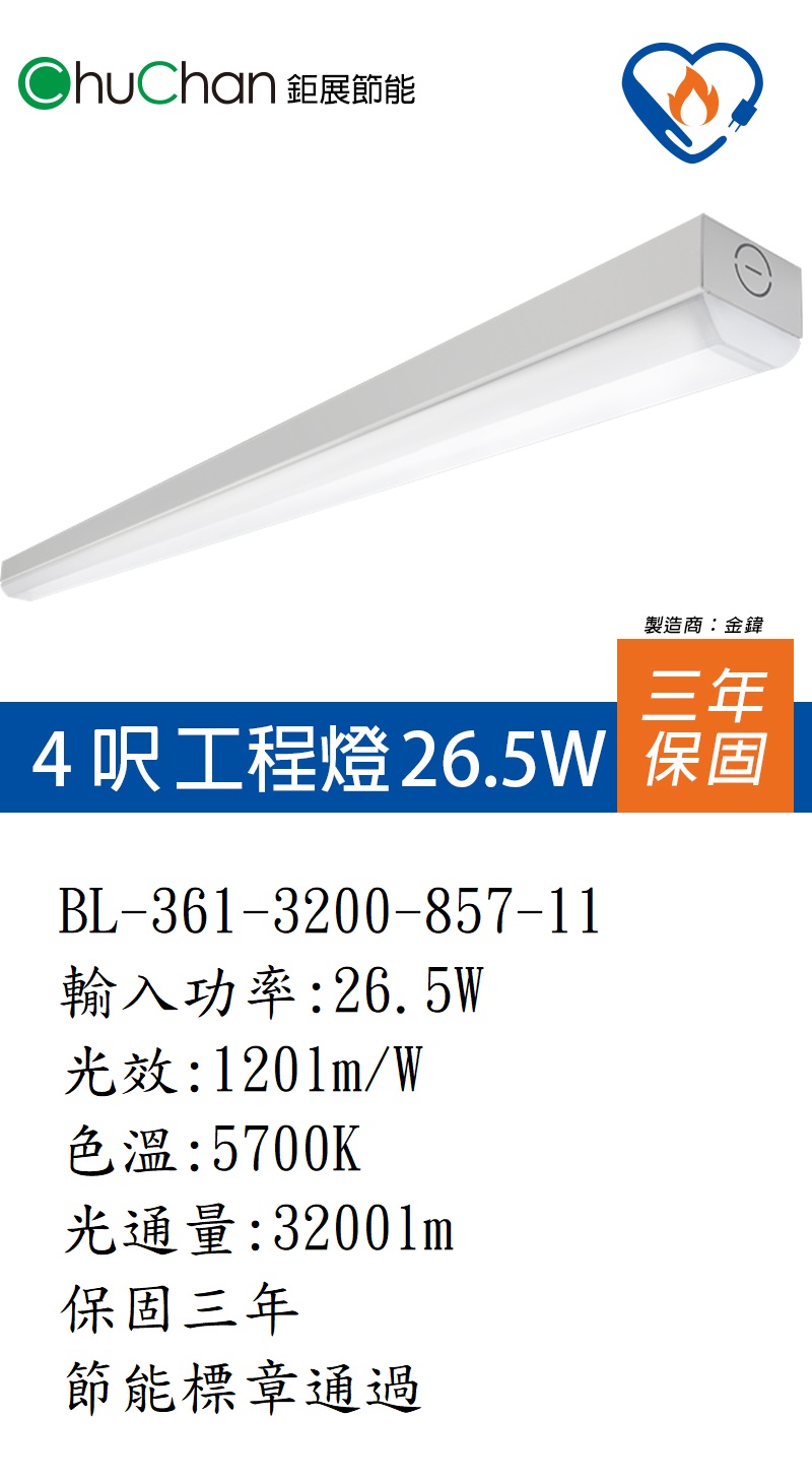 BL-361-3200-857-11、輸入功率:26.5W、光效:120lm/W、色溫:5700K、光通量:3200lm、保固三年、節能標章通過