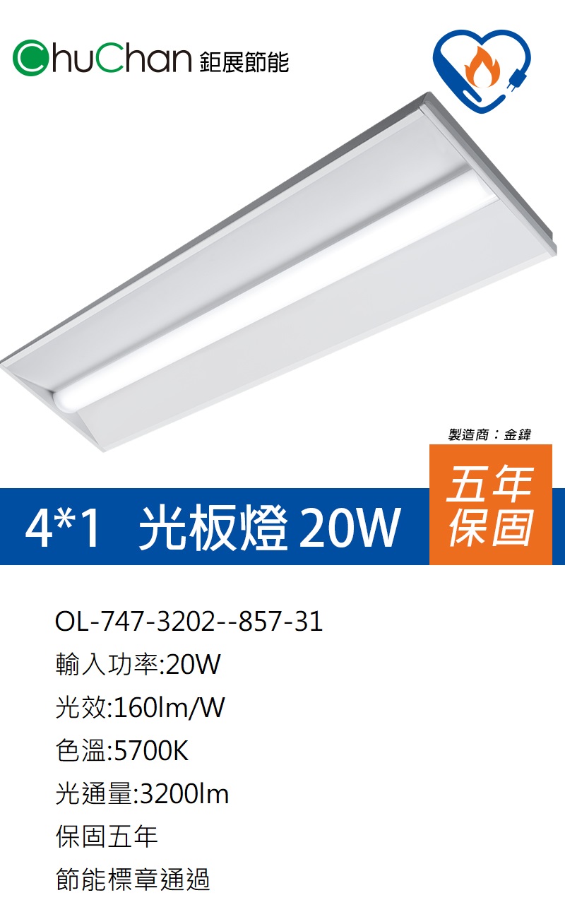 OL-747-3202--857-31、輸入功率:20W、光效:160lm/W、色溫:5700K、光通量:3200lm、保固五年、節能標章通過