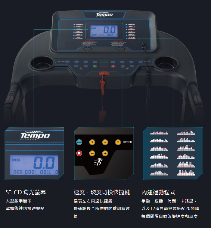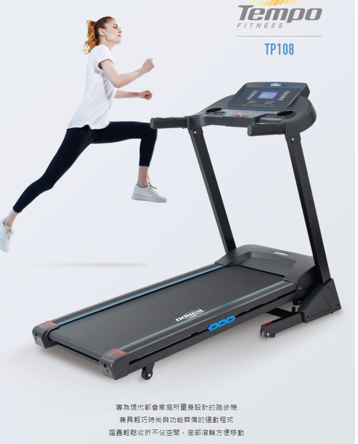 運費現場評估另計 廠牌:TEMPO 型號:TP108電動跑步機 持續馬力:1.75 HP 仰昇坡度:0 ~ 15% 速度範圍:0.8 ~ 15公里 展開尺寸:159 × 71 × 124 公分 折收尺寸:95 × 68 × 128 公分 重量:54 公斤 最大載重:110 公斤 電源:110V