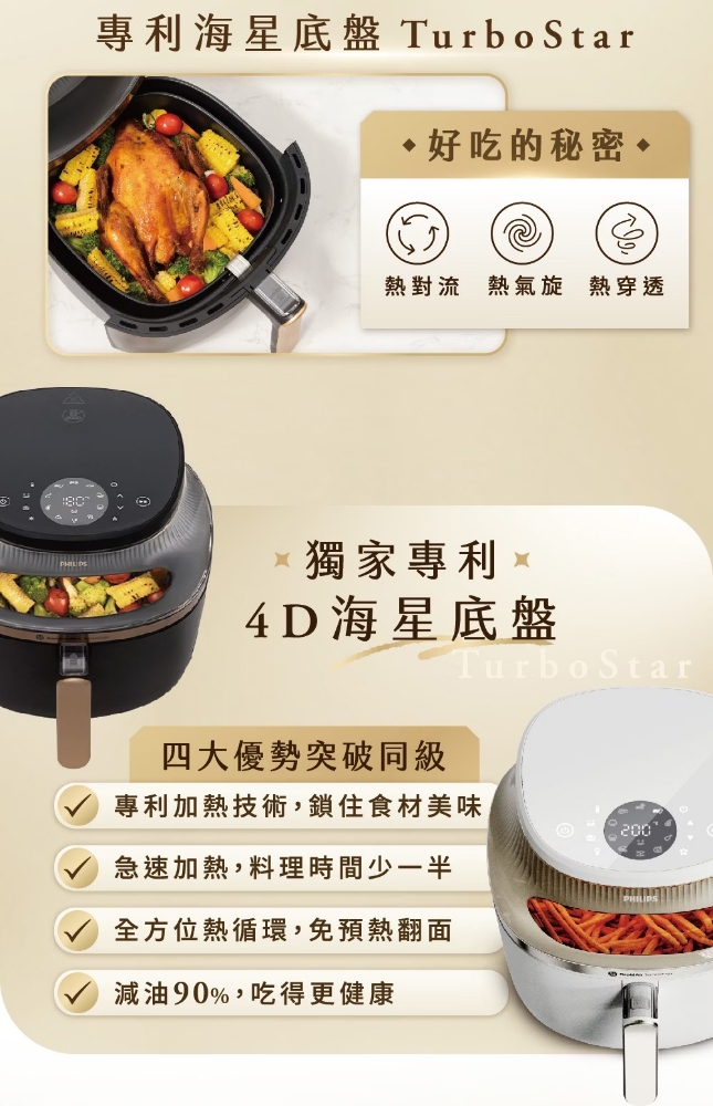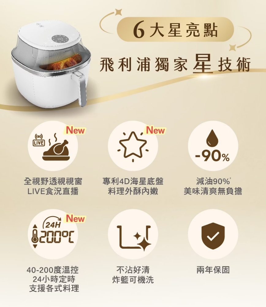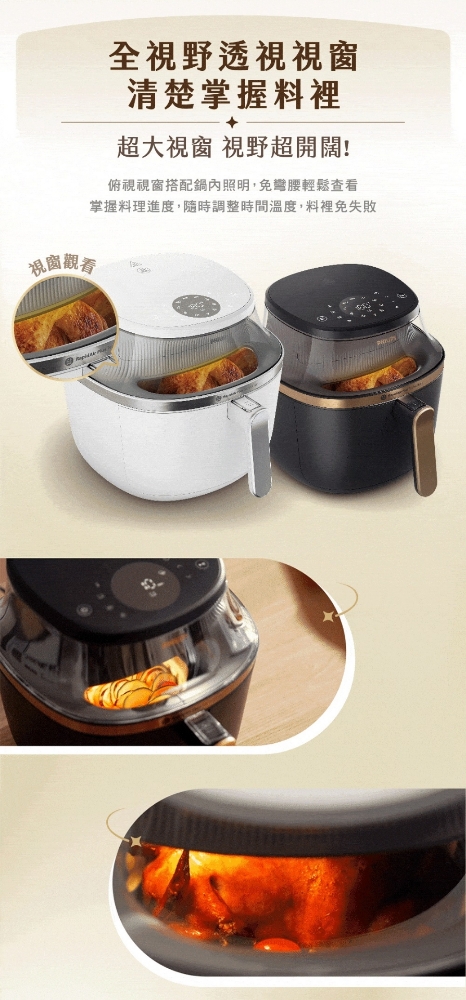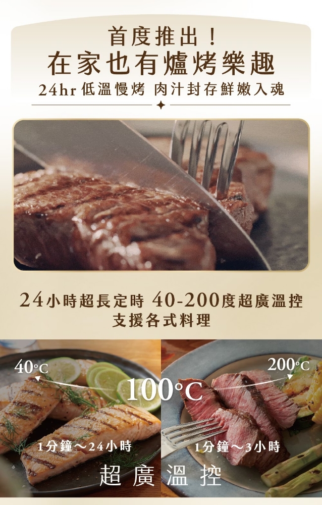 視窗加大96%,輕鬆俯視料理進度 專利海星底盤 4D升級 熱對流速度+52% 外酥內嫩更好吃 溫度區間40-200 度超廣溫度 X 24小時定時 智慧預設八種模式,直覺便利