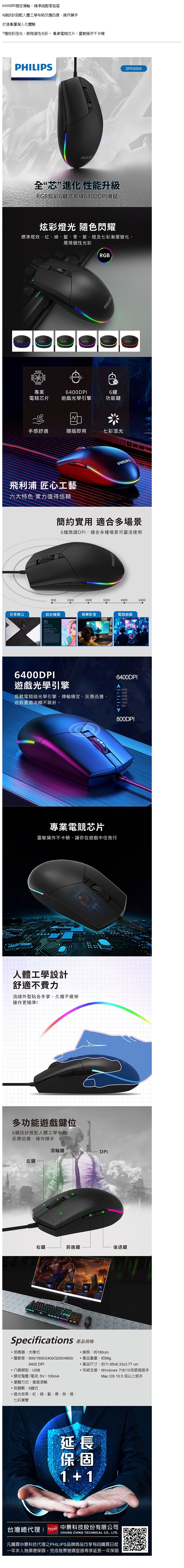 飛利浦PHILIPS炫彩6鍵式有線6400DPI滑鼠