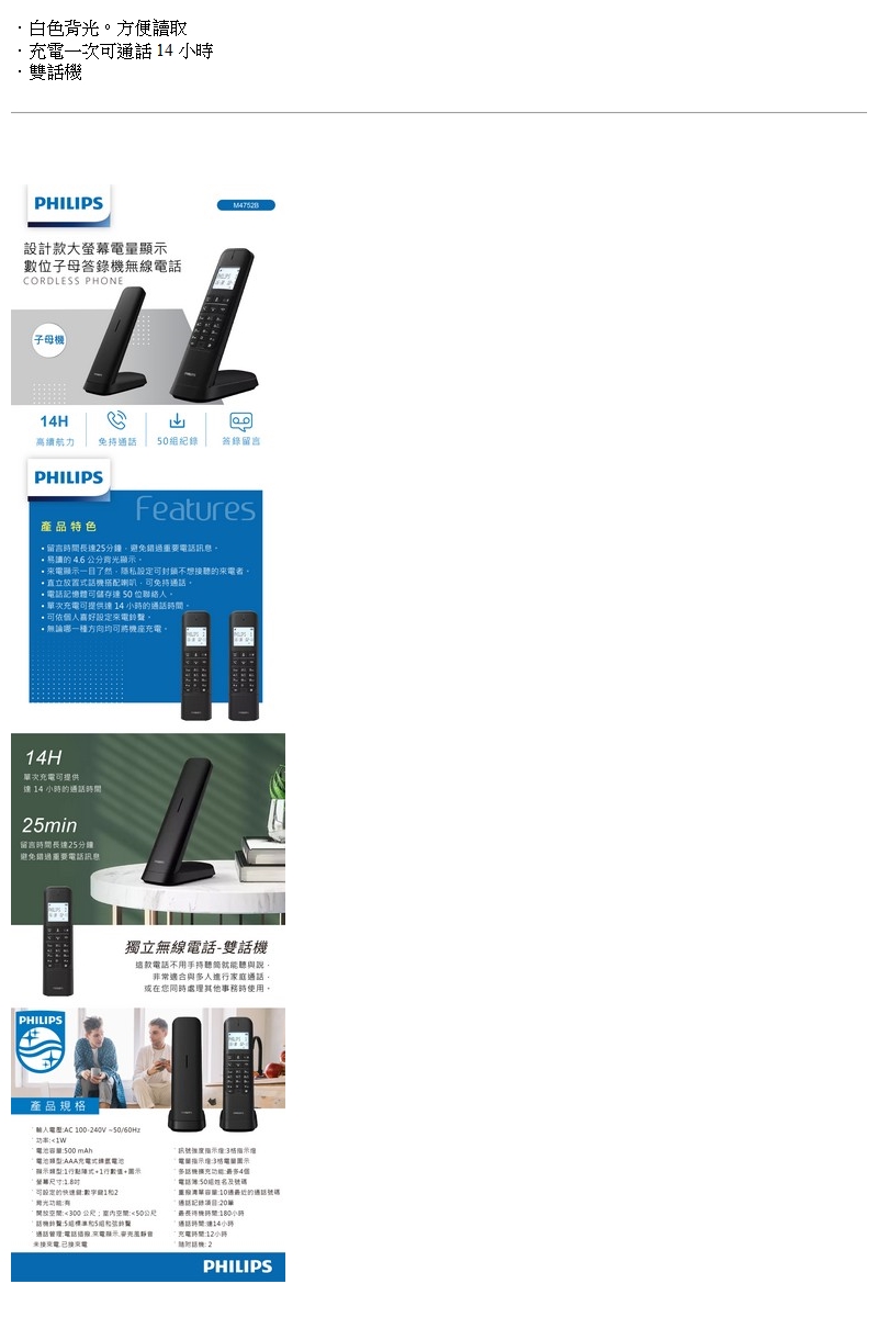 飛利浦PHILIPS設計款大螢幕子母機無線電話