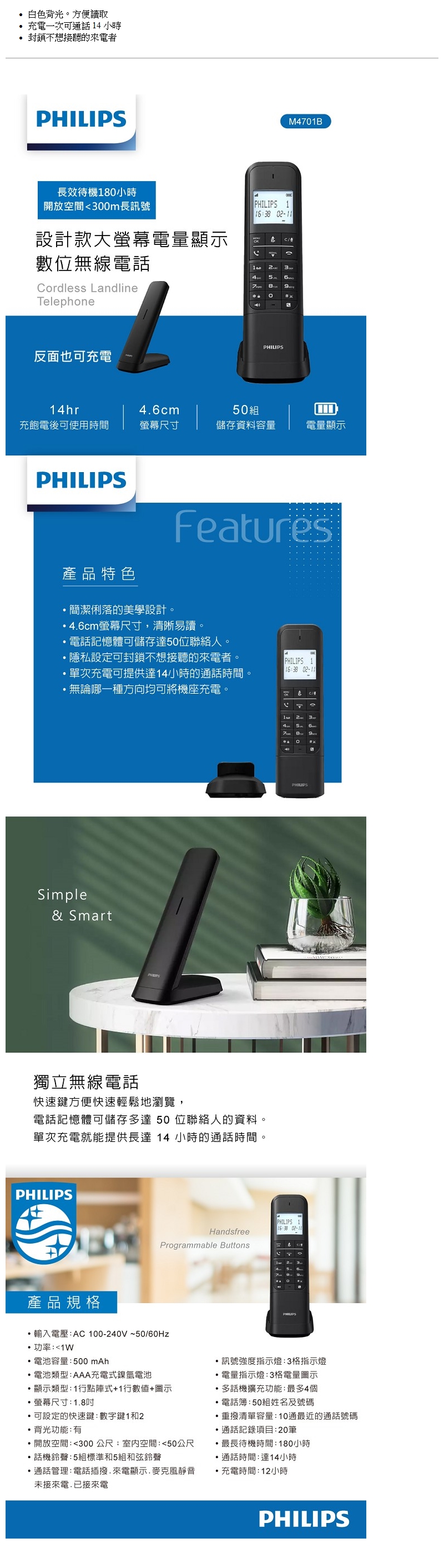 飛利浦PHILIPS設計款大螢幕電量顯示數位無線電話