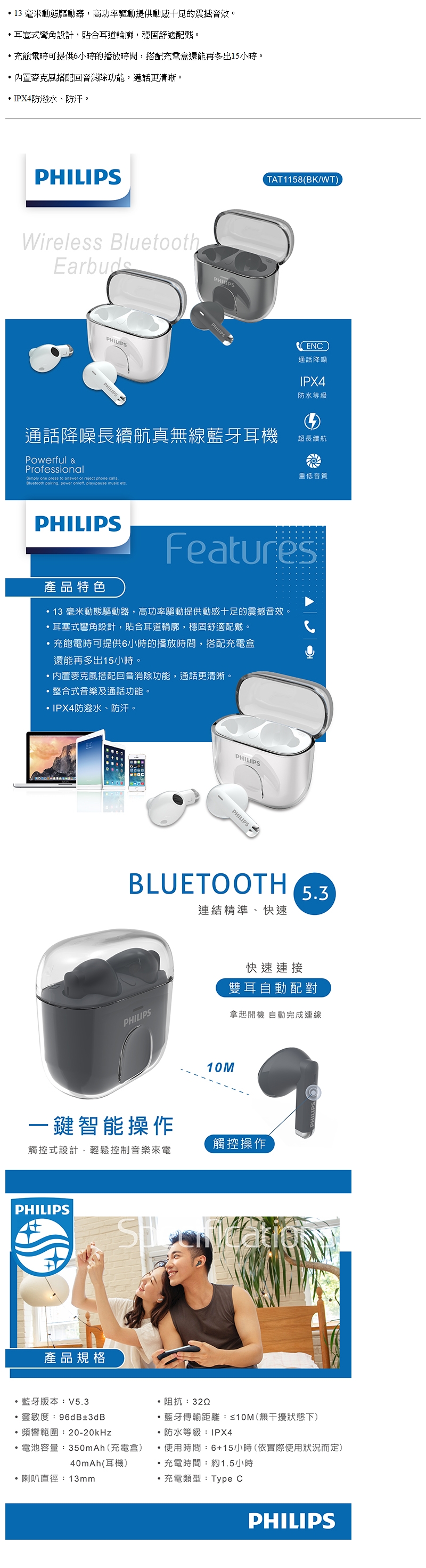 飛利浦PHILIPS通話降噪藍牙耳機