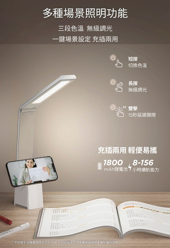 🔷充電插座兩用檯燈 🔷 創新A字形燈體結構設計,穩固平台,可放手機或平板 🔷 磁吸式闔蓋,折疊後自動開啟小夜燈模式 🔷 內建鋰電池,停電也可用,超高續航電力(最高亮8小時,最低亮156小時) 🔷 三檔色溫(3000K/4000K/5000K)調節,亮度調節無級段 🔷 遠離藍光危害、低頻閃抑制、勻亮科技