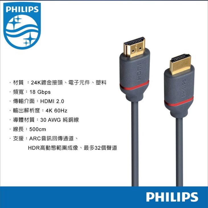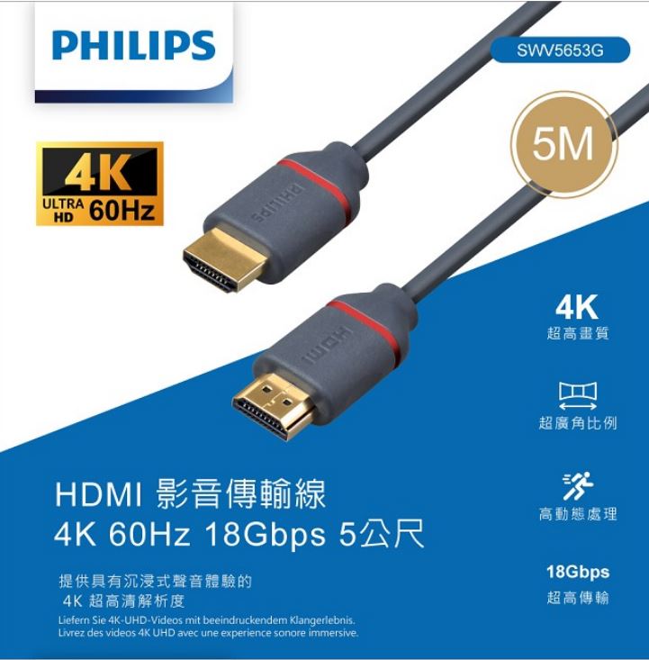 飛利浦PHILIPS HDMI 4K影音傳輸線/SWV5653G/5M