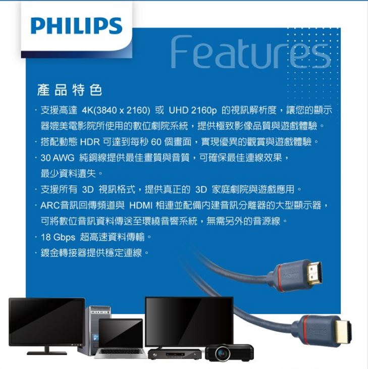 飛利浦PHILIPS HDMI 4K影音傳輸線/SWV...