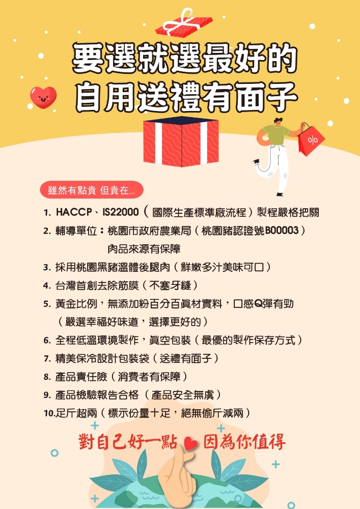 十大優點: 1.HACCP、ISO22000(國際生產標準廠流程)製程嚴格把關 2.輔導單位:桃園市政府農業局(桃園豬認證號B00003)肉品來源有保障 3.採用桃園黑豬溫體後腿肉(鮮嫩多汁美味可口) 4.台灣首創去除筋膜(不塞牙縫) 5.黃金比例,無添加粉百分百真材實料,口感Q彈有勁(嚴選幸福好味道,選擇更好的) 6.全程低溫環境製作,真空包裝(最優的製作保存方式) 7.精美保冷設計包裝袋(送禮有面子) 8.產品責任險(消費者有保障) 9.產品檢驗報告合格 (產品安全無虞) 10.足斤超兩(標示份量十足,絕無偷斤減兩) |