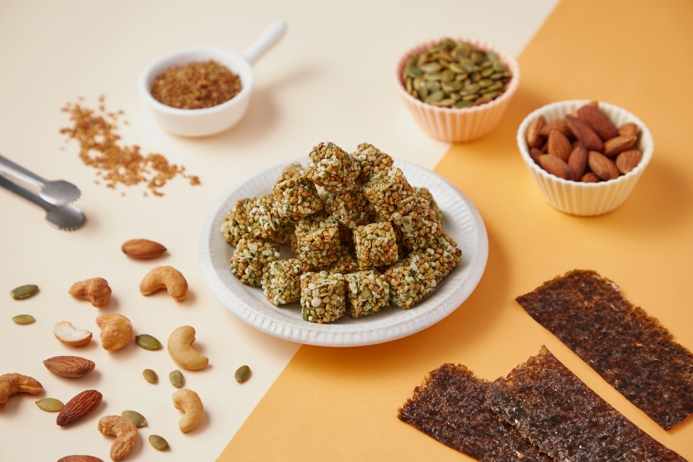 堅果脆丸子(海苔風味): 黃金蕎麥粒、砂糖、米、南瓜子、腰果、杏仁片、棕櫚油、海苔粉、食鹽、酵母抽出物、白胡椒