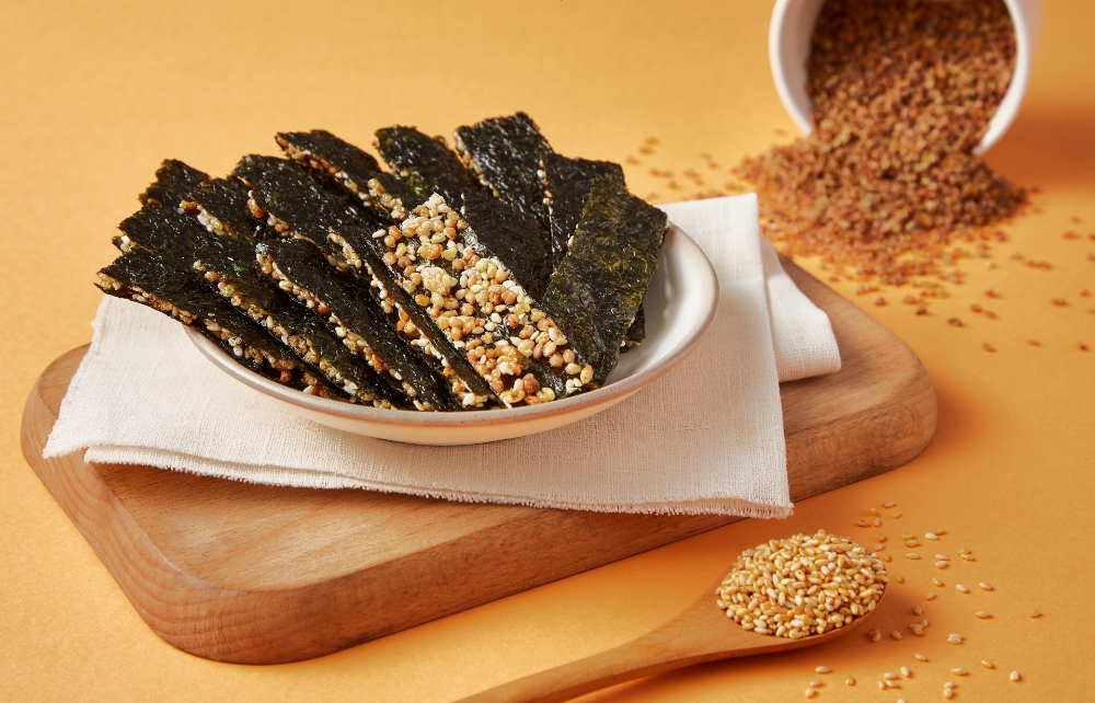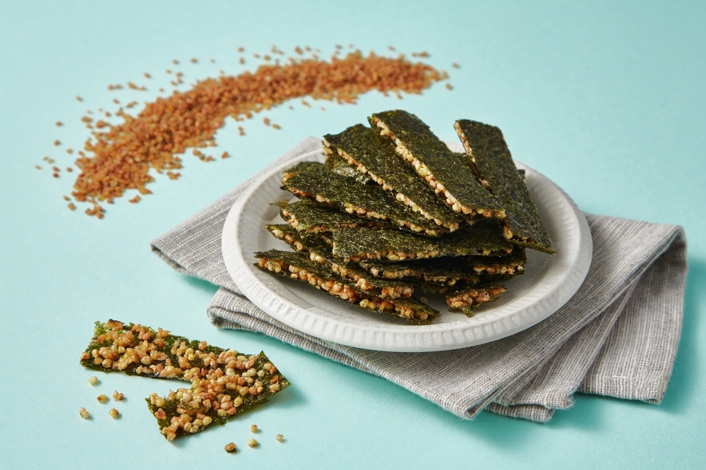 海苔薄燒(蕎麥芝麻): 麥芽糖、黃金蕎麥粒、芝麻、海苔、鹽、酵母抽出物
