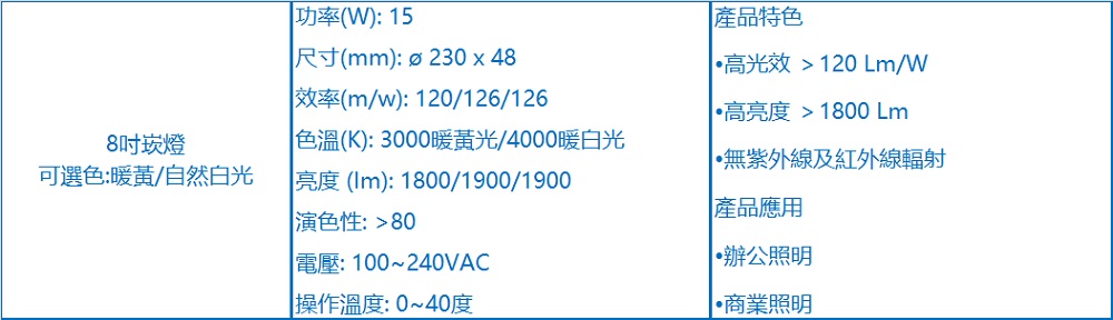 功率(W): 15 尺寸(mm): ø 230 x 48 效率(m/w): 120/126/126 色溫(K): 3000暖黃光/4000暖白光 亮度 (Im): 1800/1900/1900 演色性: >80 電壓: 100~240VAC 操作溫度: 0~40度 產品特色 •高光效 >120 Lm/W •高亮度 >1800 Lm •無紫外線及紅外線輻射 產品應用 •辦公照明 •商業照明