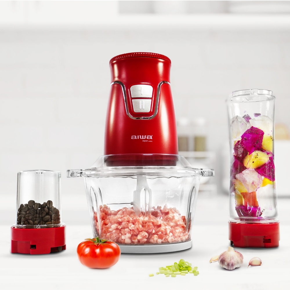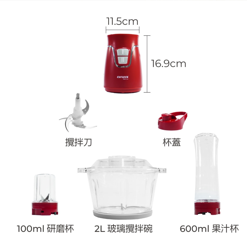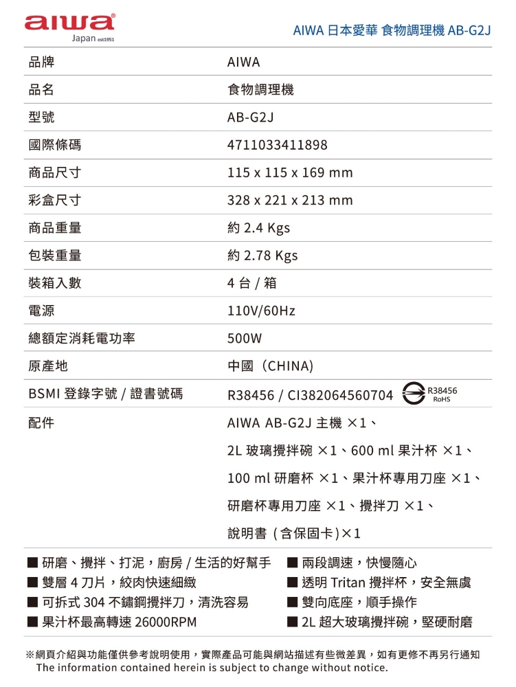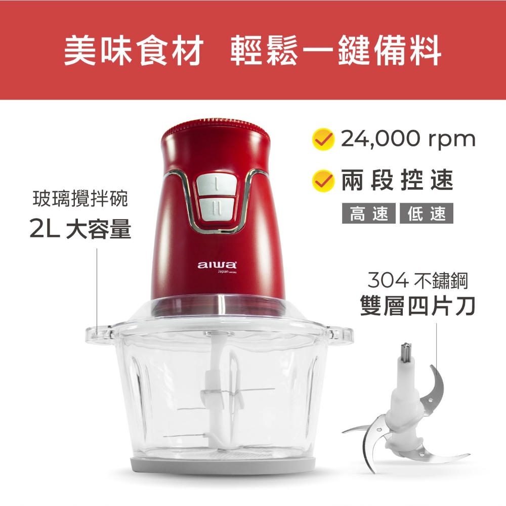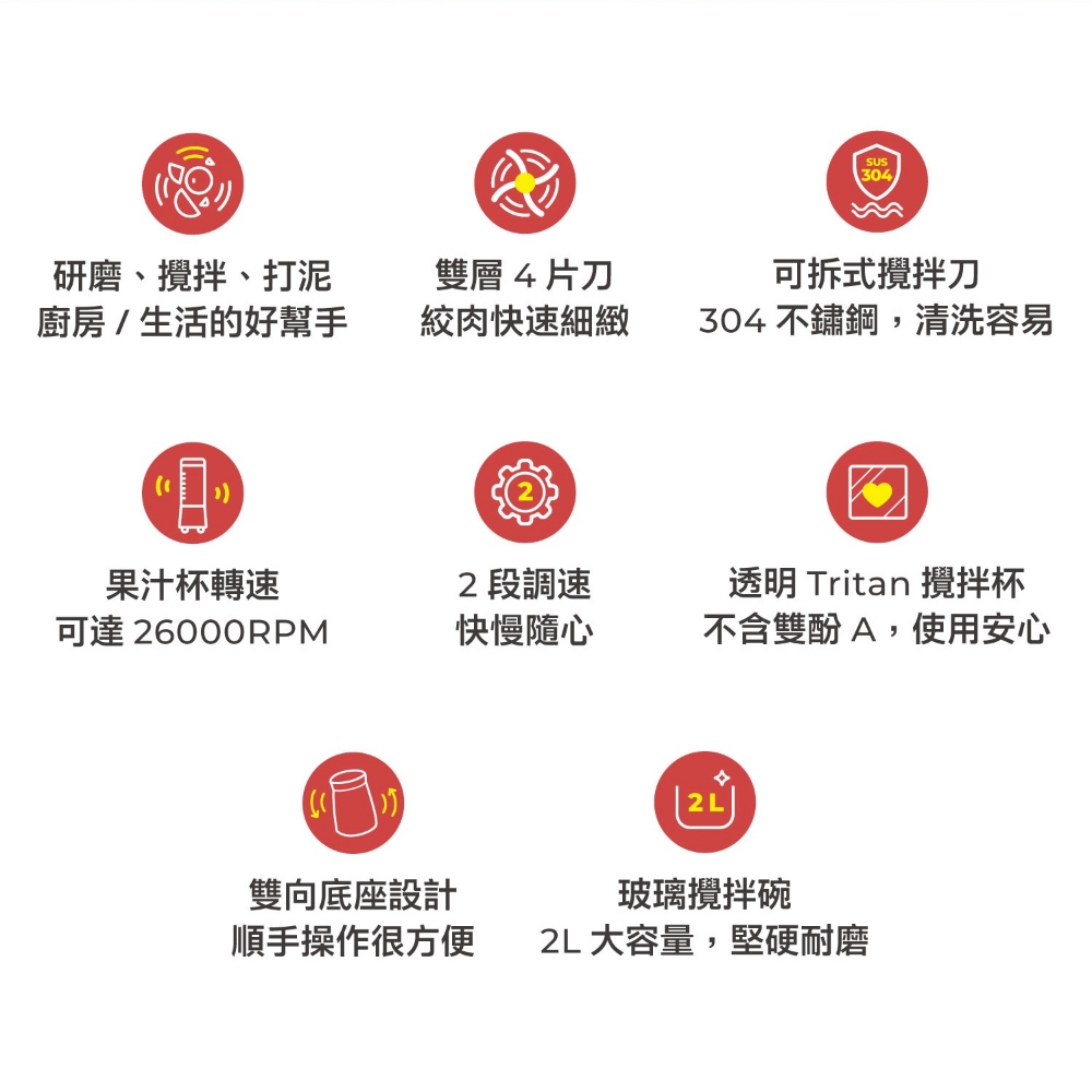 研磨、攪拌、打泥,廚房/生活的好幫手 雙向底座 , 順手操作 2升超大玻璃攪拌碗 , 堅硬耐磨 可拆式304不鏽鋼攪拌刀 , 清洗容易 透明Tritan攪拌杯 , 安全無虞 果汁杯最高轉速26000RPM 雙層4刀片 , 絞肉快速細緻 兩段調速 , 快慢隨心