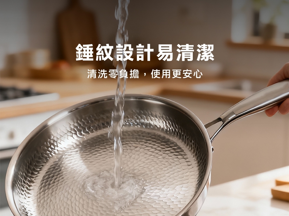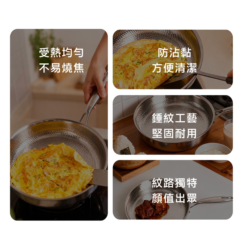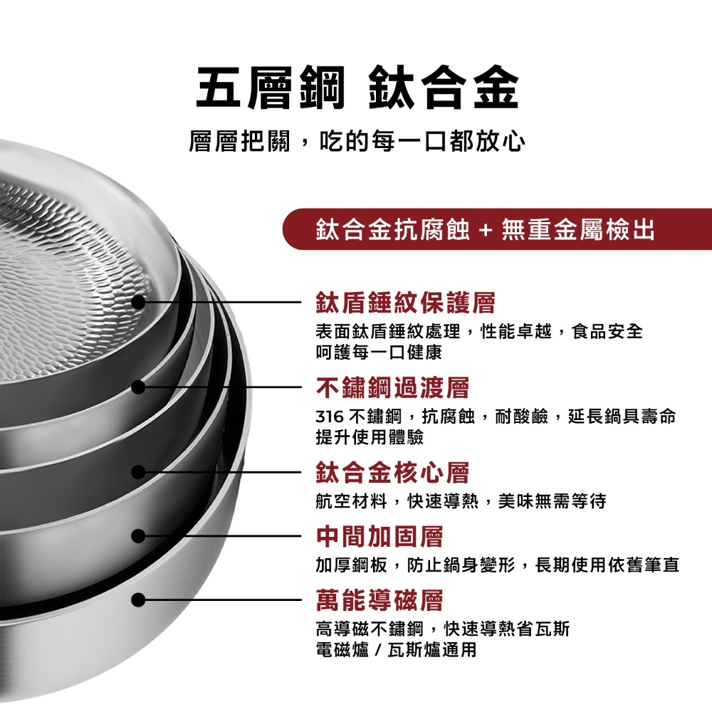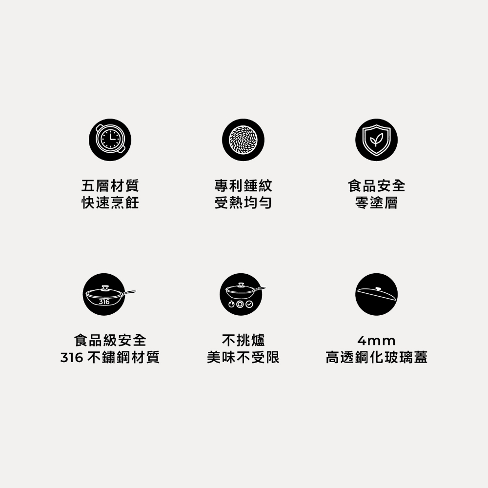 五層材質,快速烹飪 食品安全,零塗層 不挑爐,美味不受限 專利錘紋,受熱更均勻 食品級安全,316不鏽鋼 透明烹飪,4mm高透鋼化玻璃蓋