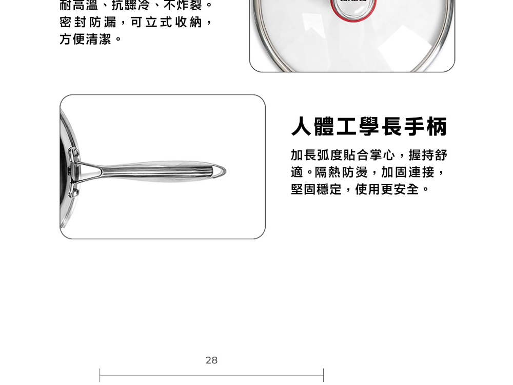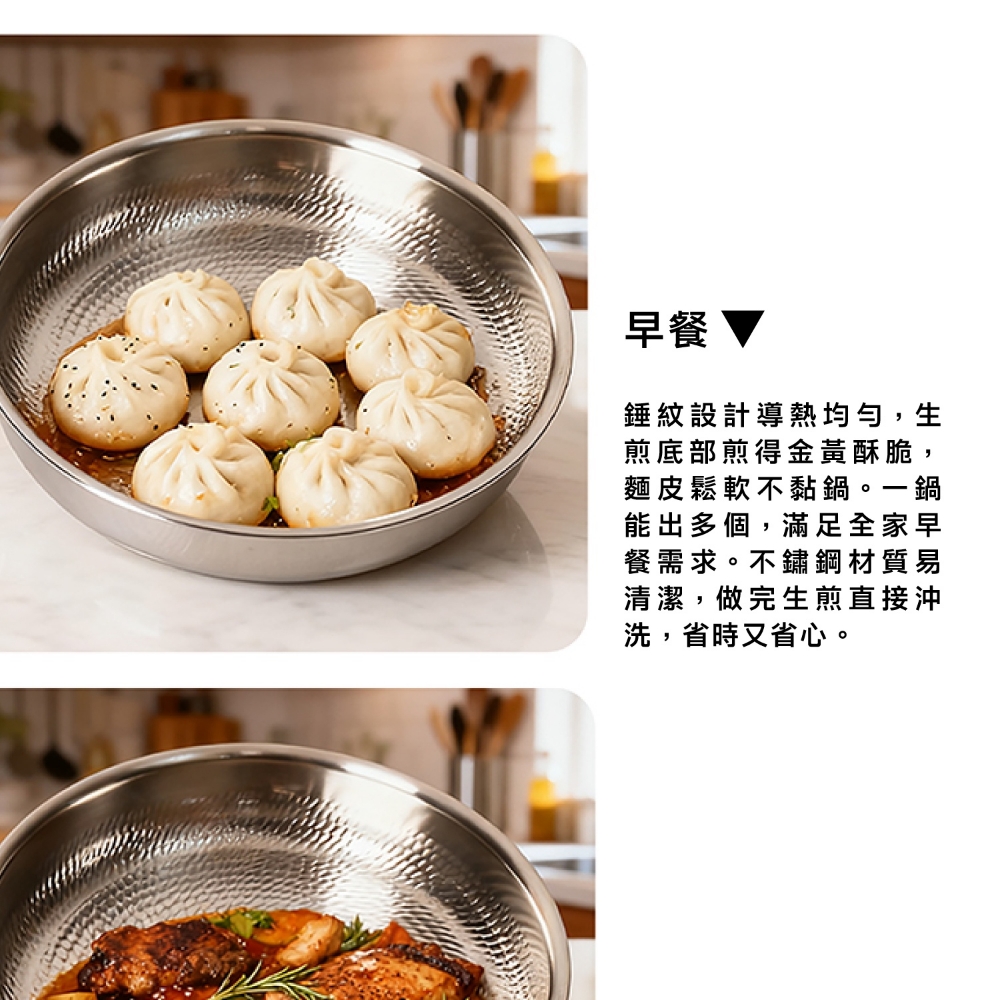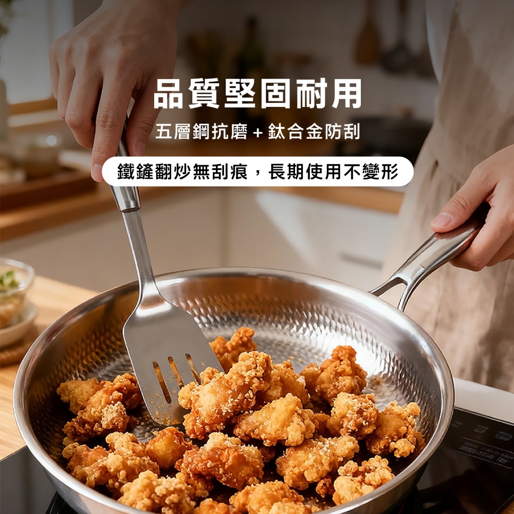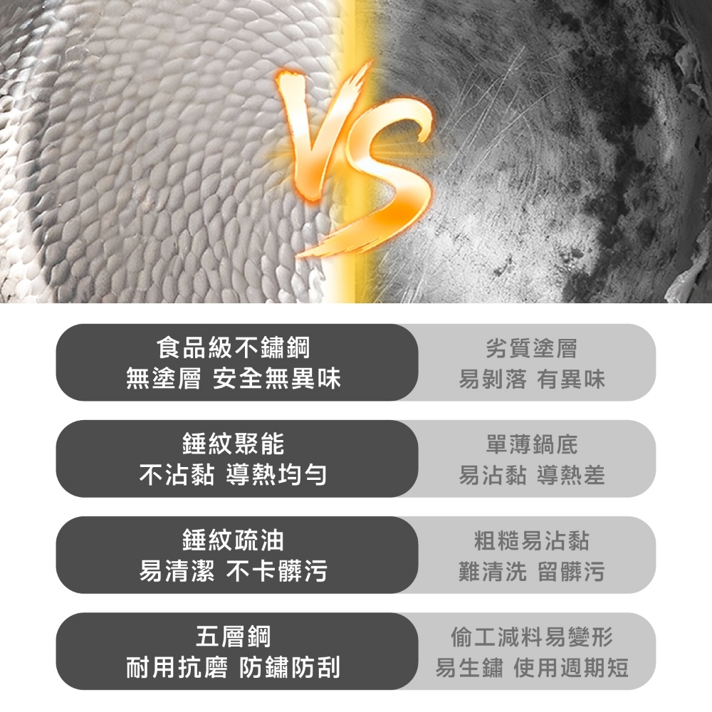 五層材質,快速烹飪 食品安全,零塗層 不挑爐,美味不受限 專利錘紋,受熱更均勻 食品級安全,316不鏽鋼 透明烹飪,4mm高透鋼化玻璃蓋