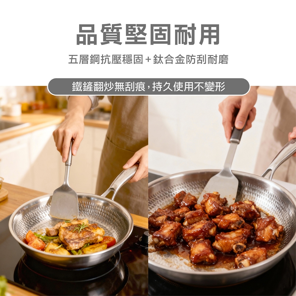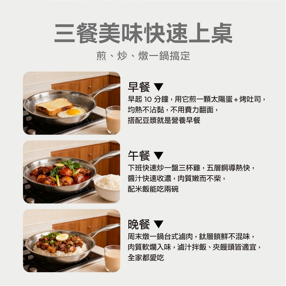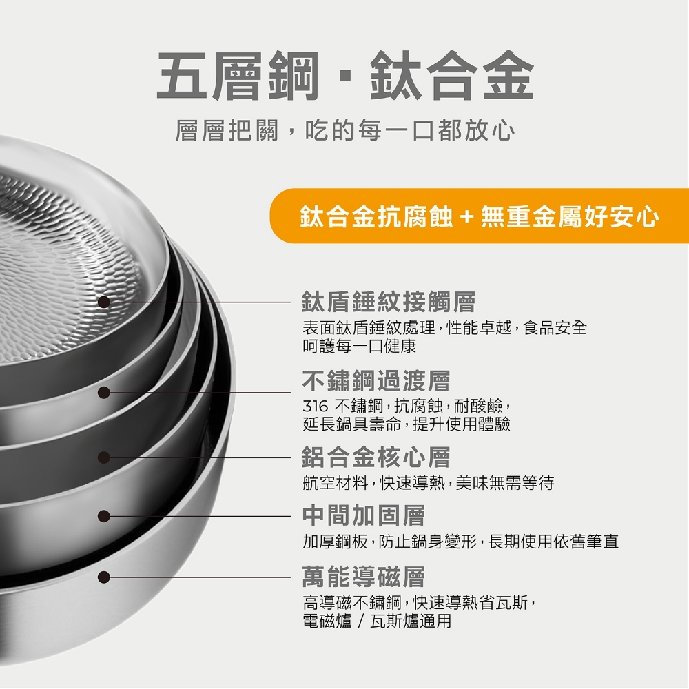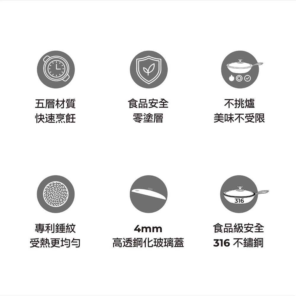 .五層材質,快速烹飪 .食品安全,零塗層 .不挑爐,美味不受限 .專利錘紋,受熱更均勻 .食品級安全,316 不鏽鋼 .透明烹飪,4mm 高透鋼化玻璃蓋