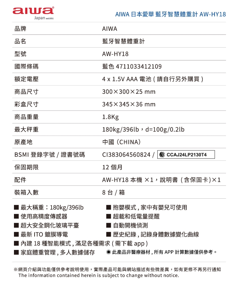 AIWA 愛華藍牙智慧體重計 AW-HY18