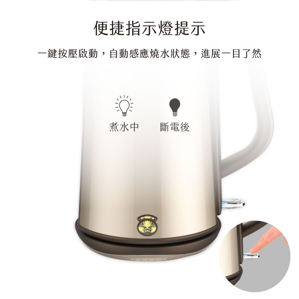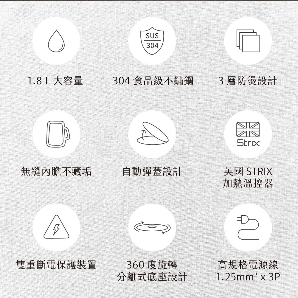304不鏽鋼材質 三層防燙不鏽鋼電茶壺 一鍵開啟壺蓋 英國STRIX加熱溫控器 高效能底部加熱 煮水時亮指示燈 最大容量約1.8 L