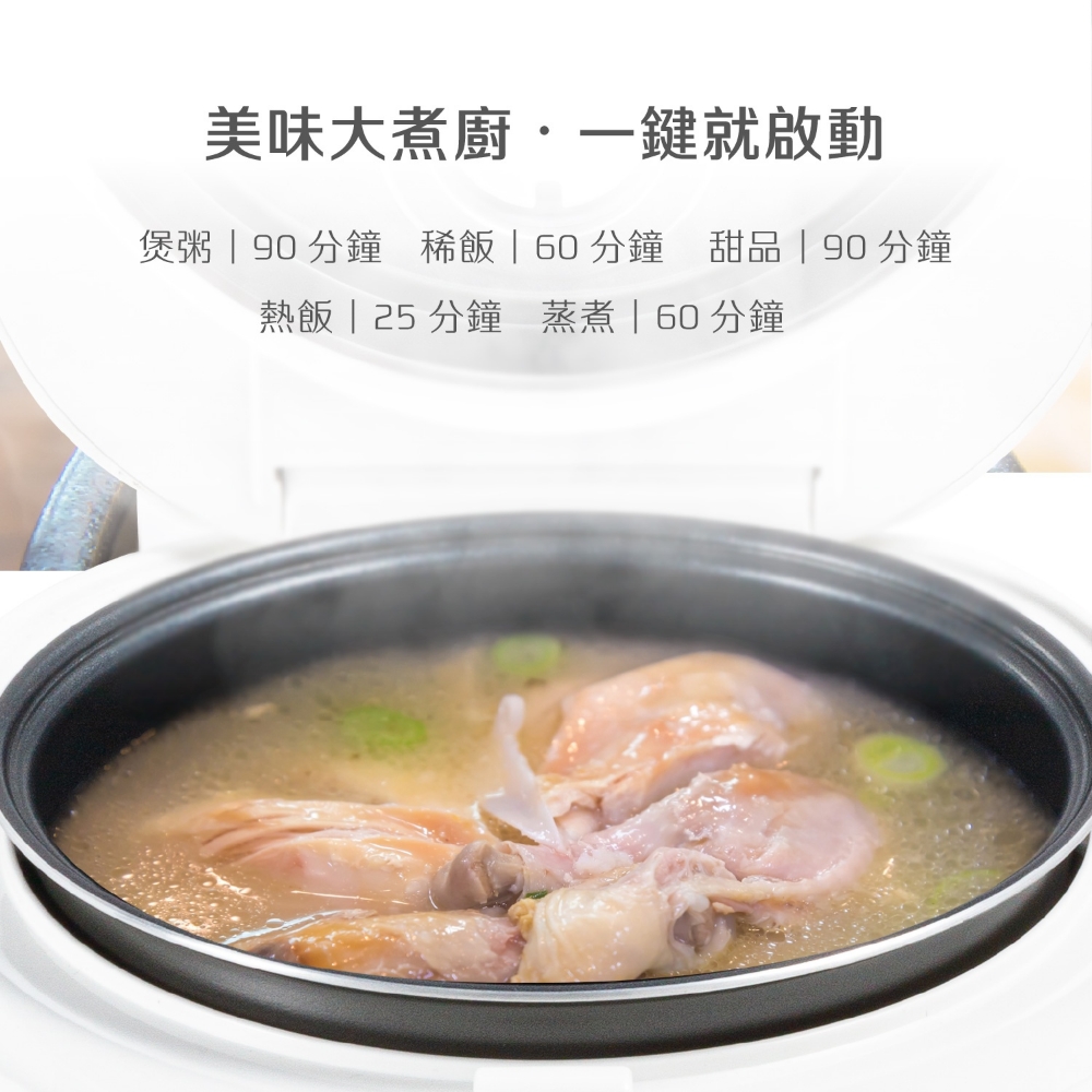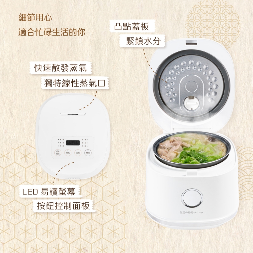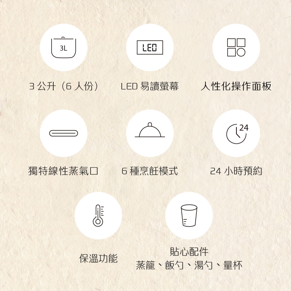 3公升精巧容量 獨特線性蒸氣口,快速散發蒸氣 頂部操作面板,更符合人性操作 6大功能選項,簡單操作 預約功能,高效烹飪
