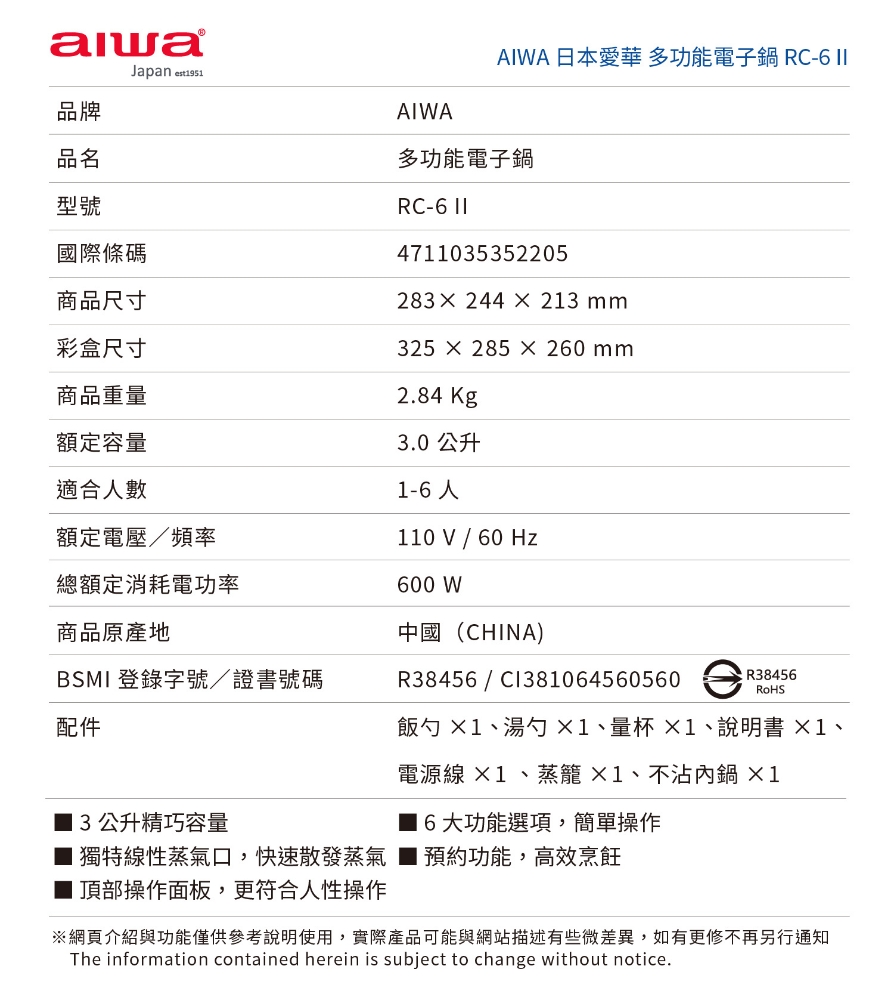 AIWA 愛華 3L 微電腦多功能電子鍋 RC-6 Ⅱ