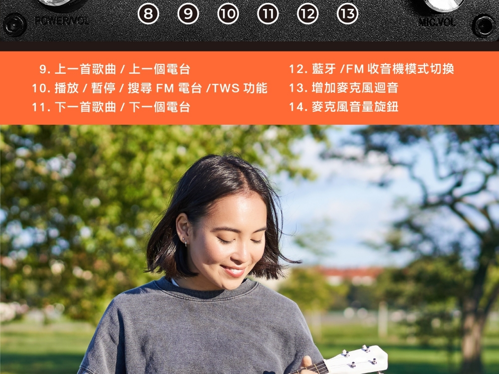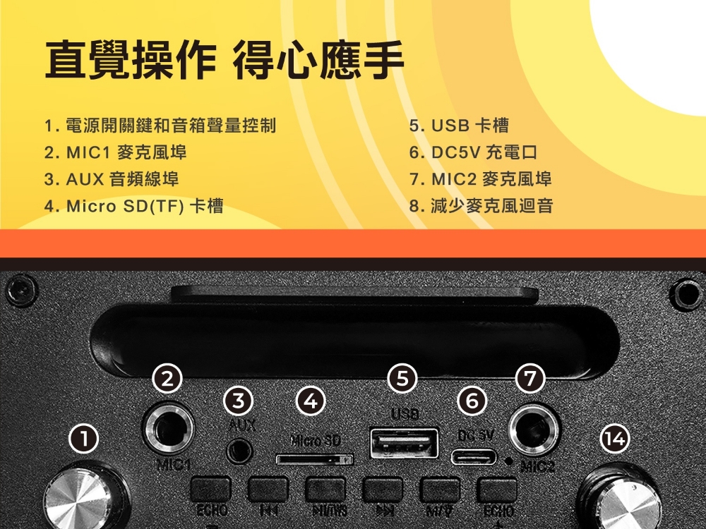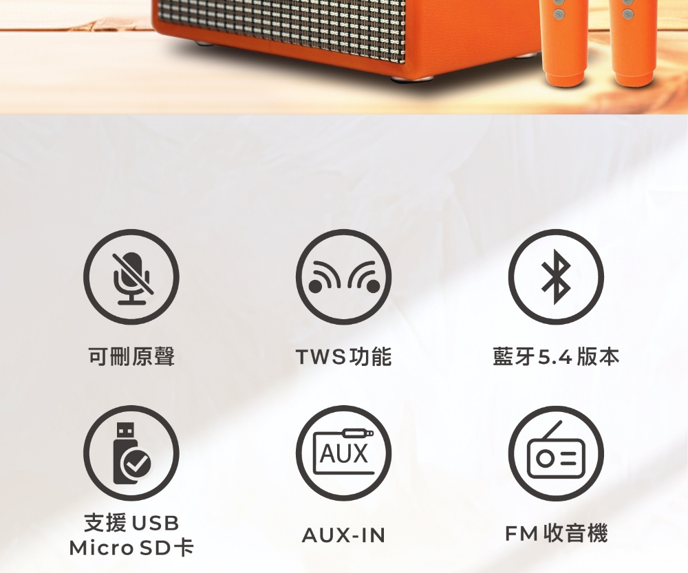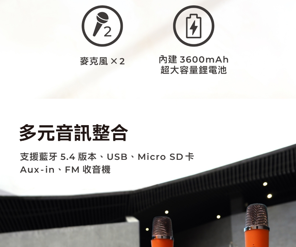 藍牙 5.4 支援 USB、Micro SD 卡、Aux in FM 收音機 可 TWS 配對其他藍牙音箱 2 支麥克風 3600mAh 超大容量鋰電池 充電時間: 約 2.5 小時 使用時間 : 約 4 小時 ( 跟音量/使用項目有關 )