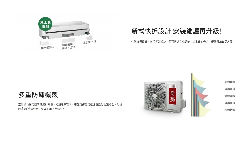 「CHIMEI 奇美節能空調產品 全機三年保固 變頻系列機型壓縮機保固十年」