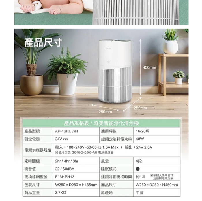 CHIMEI 奇美 波波淨20坪 智能淨化大坪數專用清淨機/HEPA H13/UV光殺菌/DC靜音馬達(AP-16HUWH) 圖片