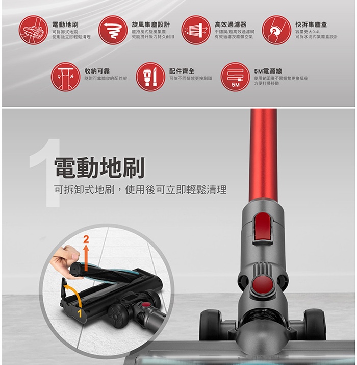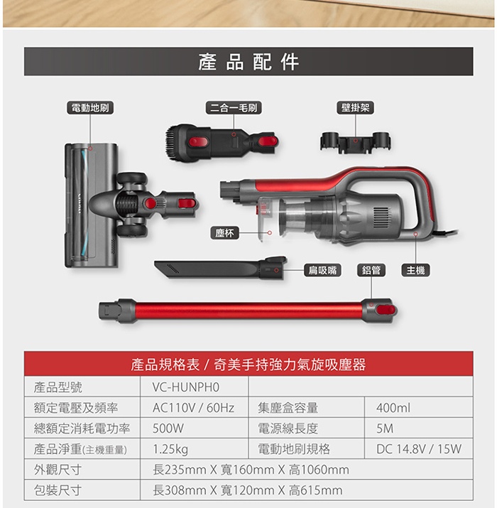 • CHIMEI 奇美 LED電動地刷手持強力氣旋吸塵器(VC-HUNPH0)