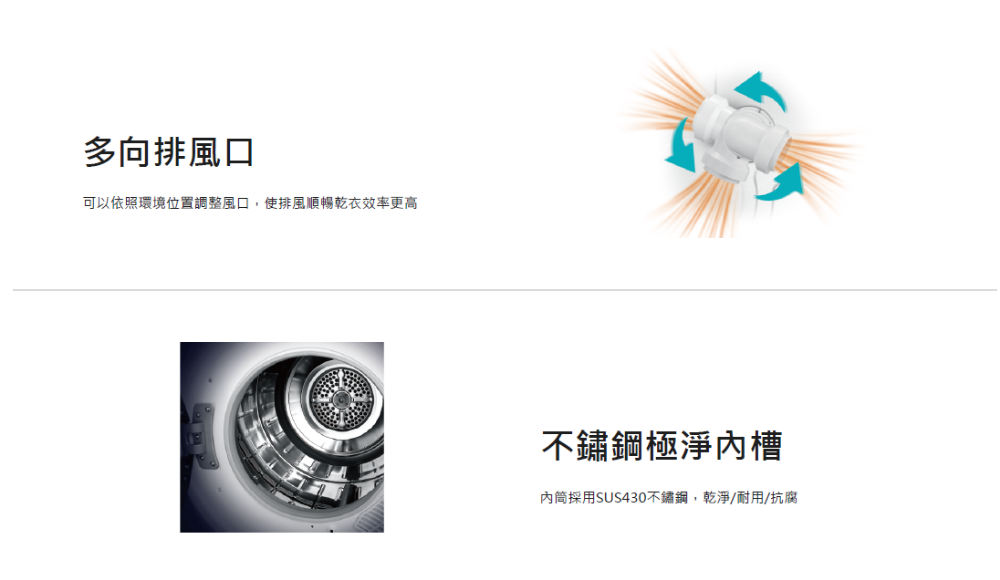 💧PTC陶瓷半導體/控制安全溫度,溫度超溫即自動斷電 💧Re-Start機能/符合最新CNS規範,使用安全更有保障 💧多向排風口/可以依照環境位置調整風口,使排風順暢乾衣效率更高 💧不鏽鋼極淨內槽/內筒採用SUS430不鏽鋼,乾淨/耐用/抗腐 ❌無安裝服務