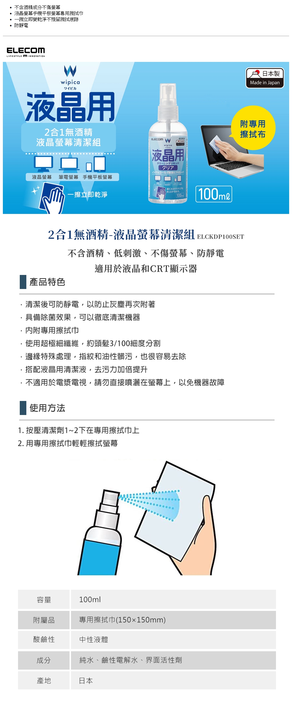 ELECOM 2合1無酒精液晶螢幕清潔組