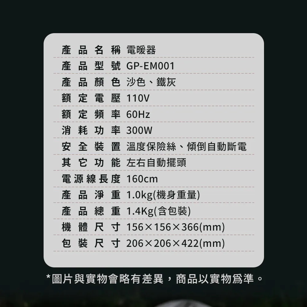 . 機身僅 1kg,輕巧好攜帶 . 發熱迅速,瞬間感受溫暖 . 露營友善功率300W . 具備左右擺頭設計,送暖更均勻 . 旋鈕操作,直覺簡單易用 . 內建傾倒斷電與過熱保護,安全無憂