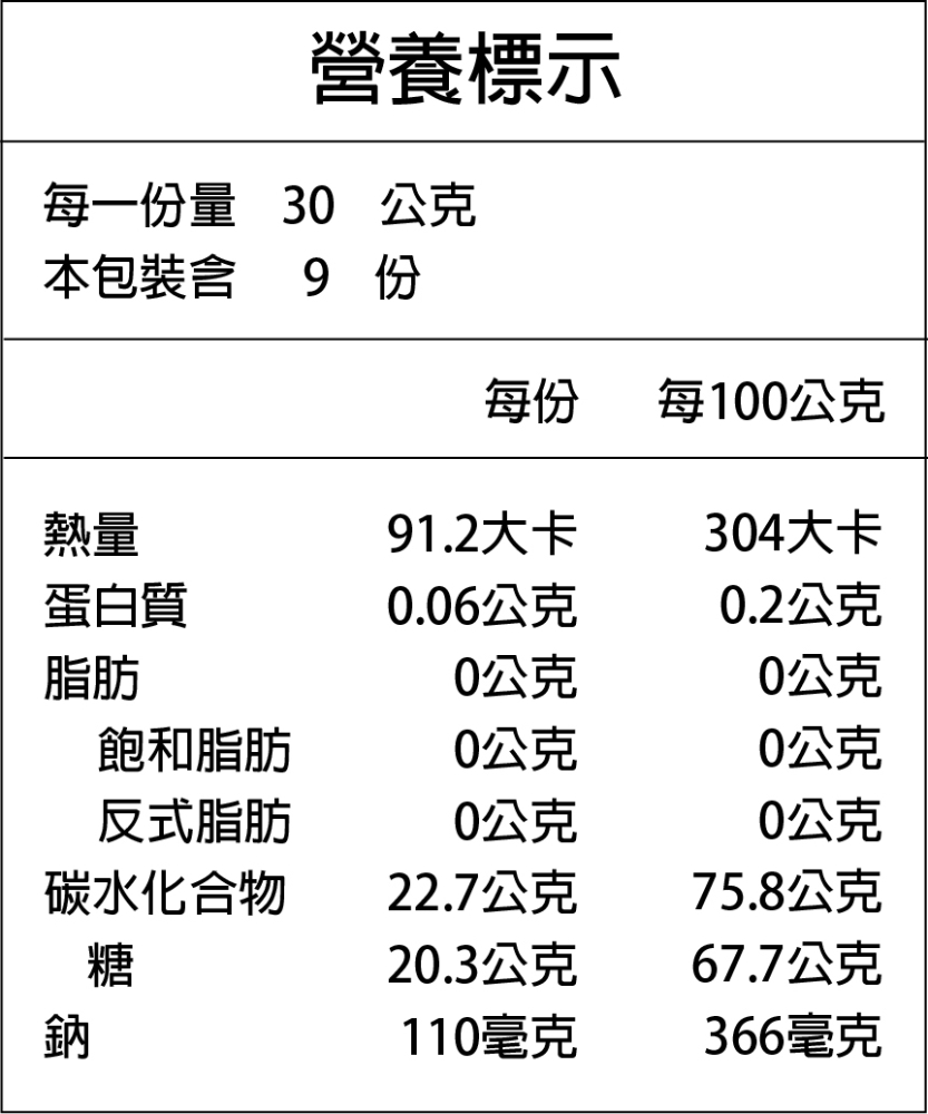 成分:糖、金桔原汁、麥芽糖(樹薯澱粉、水、液化酵素、糖化酵素)、檸檬原汁、 蘋果酸、鹽、玉米糖膠