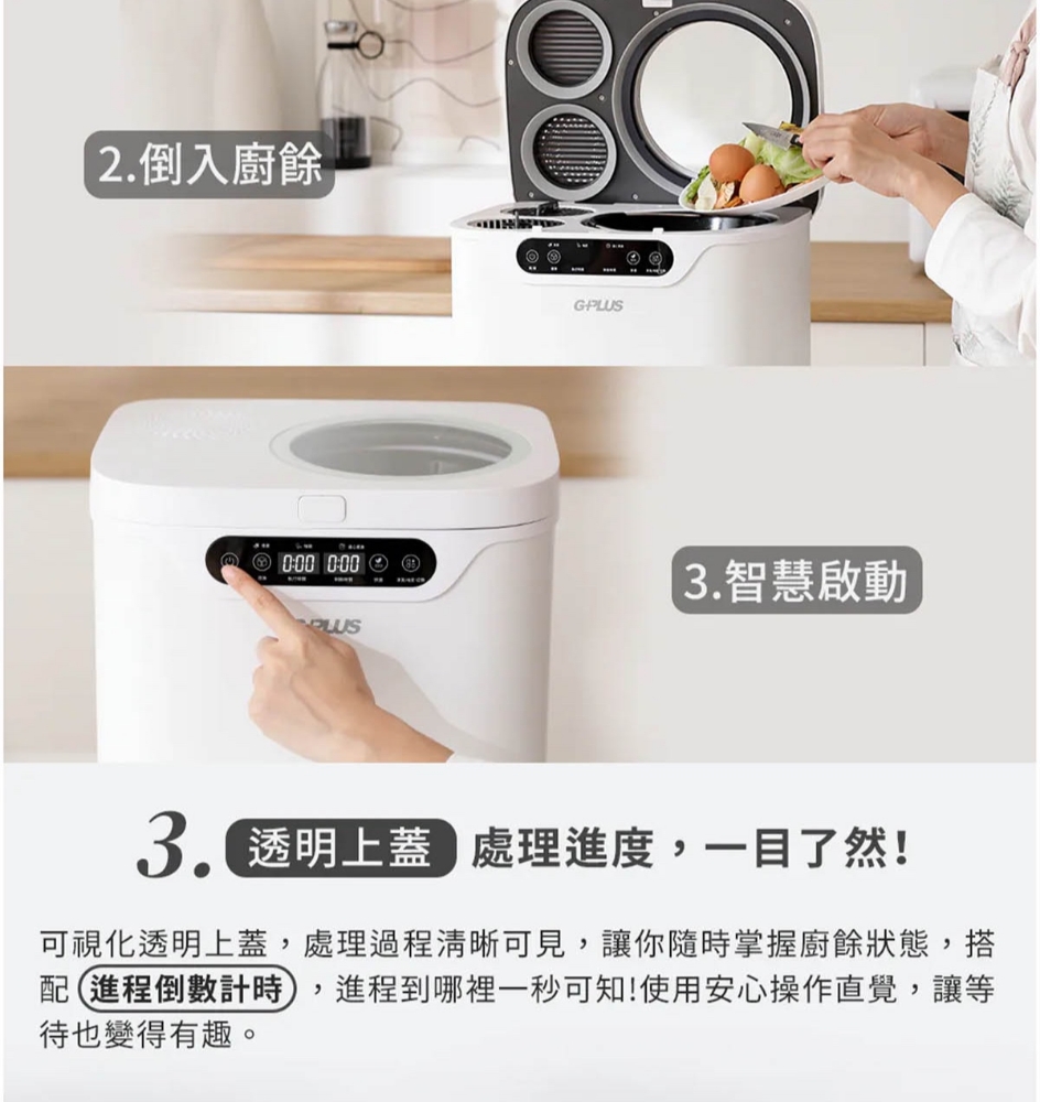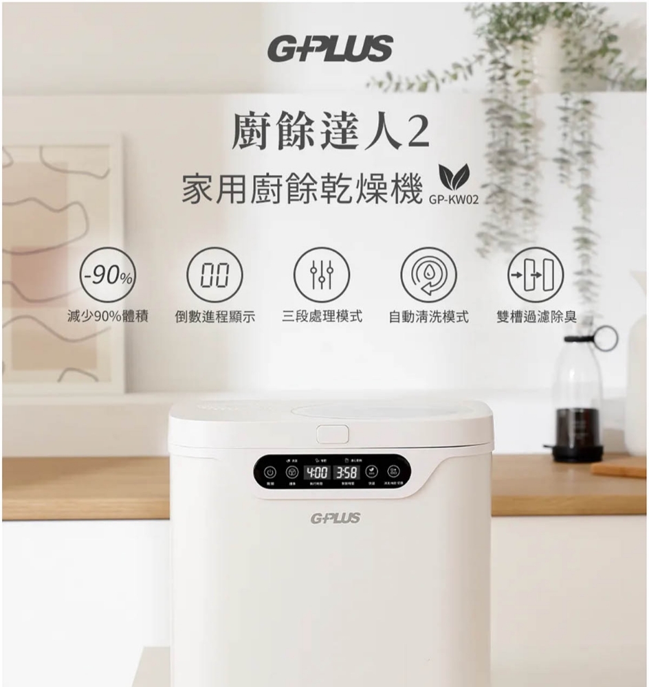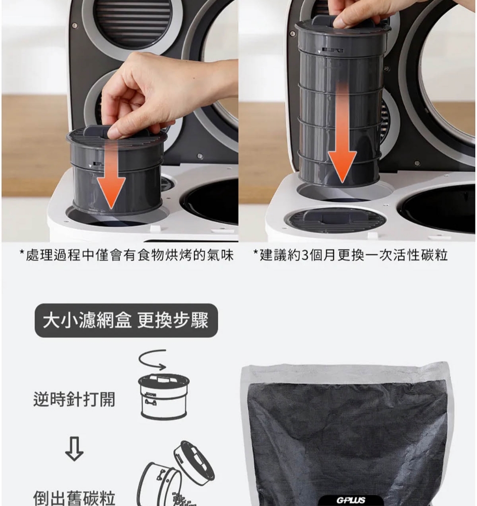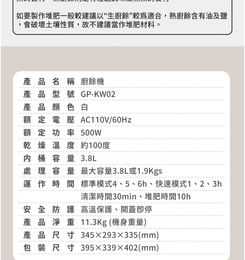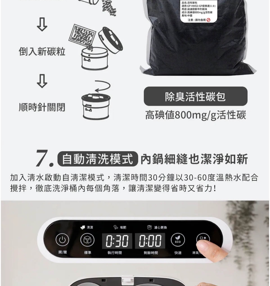 三段智慧模式可視化透明上蓋環保式雙槽活性碳過濾產品型號:GP-KW02產品顏色:白色額定電壓:AC 110V/60Hz額定功率:500W乾燥溫度:約100度內桶容量:3.8L處理容量:最大3.8L或1.9Kg運作時間:標準模式4,5,6小時 快速模式1,2,3小時 清潔時間30分鐘 推肥時間10小時產品淨重:11.3Kg產品尺寸:345*293*335mm產品內容物:主機*1/內鍋(攪拌鍋)*1/大濾心*1/小濾心*1/活性碳包*1/說明書*
