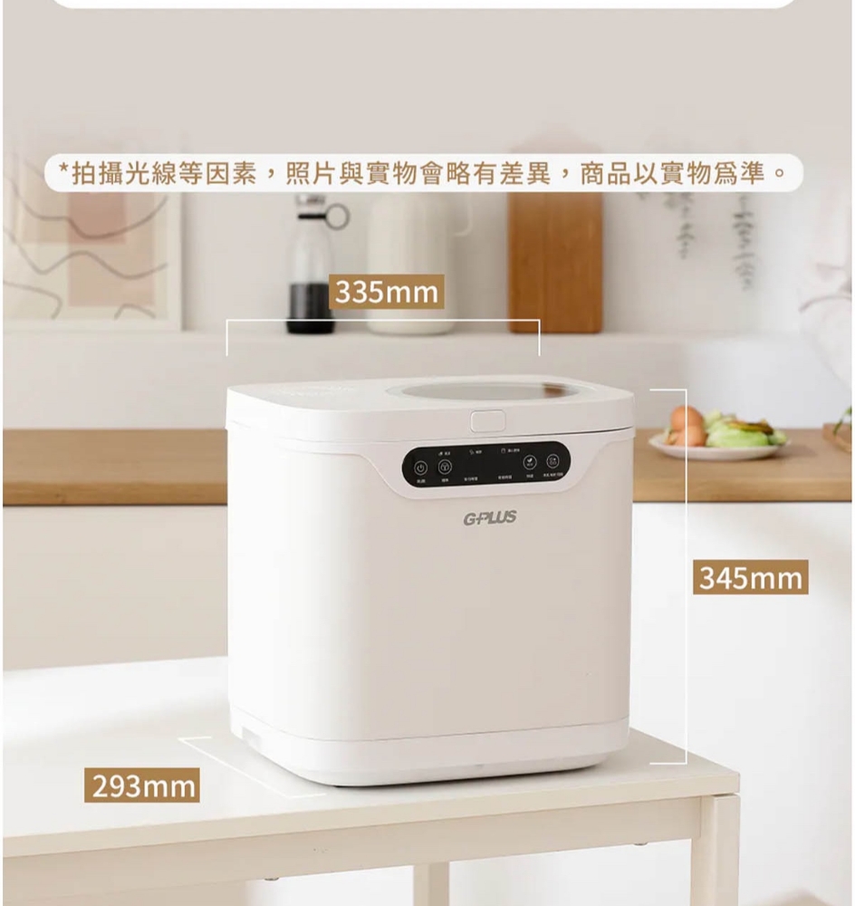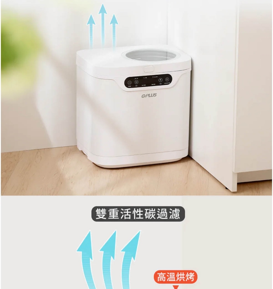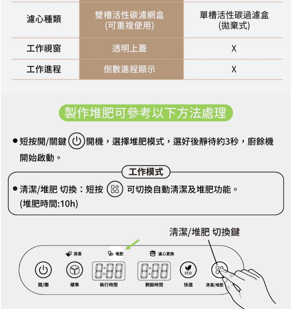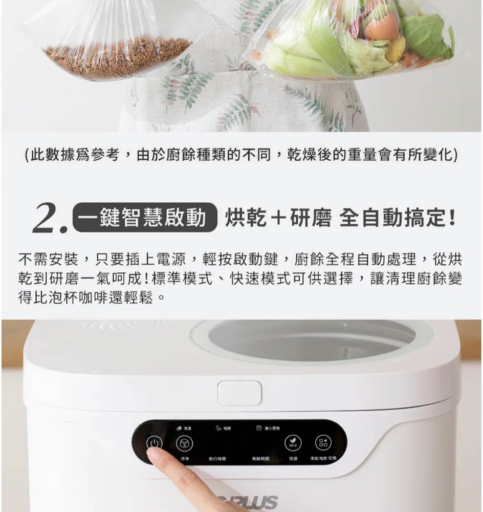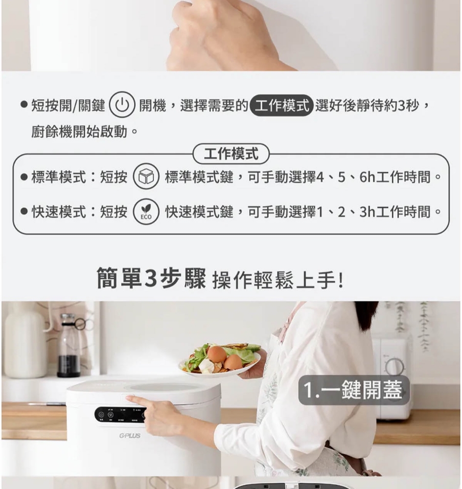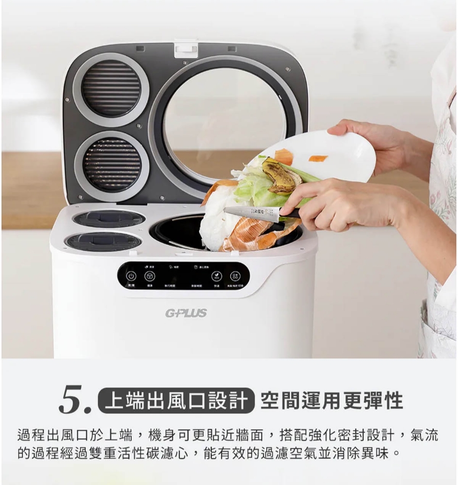 三段智慧模式可視化透明上蓋環保式雙槽活性碳過濾產品型號:GP-KW02產品顏色:白色額定電壓:AC 110V/60Hz額定功率:500W乾燥溫度:約100度內桶容量:3.8L處理容量:最大3.8L或1.9Kg運作時間:標準模式4,5,6小時 快速模式1,2,3小時 清潔時間30分鐘 推肥時間10小時產品淨重:11.3Kg產品尺寸:345*293*335mm產品內容物:主機*1/內鍋(攪拌鍋)*1/大濾心*1/小濾心*1/活性碳包*1/說明書*