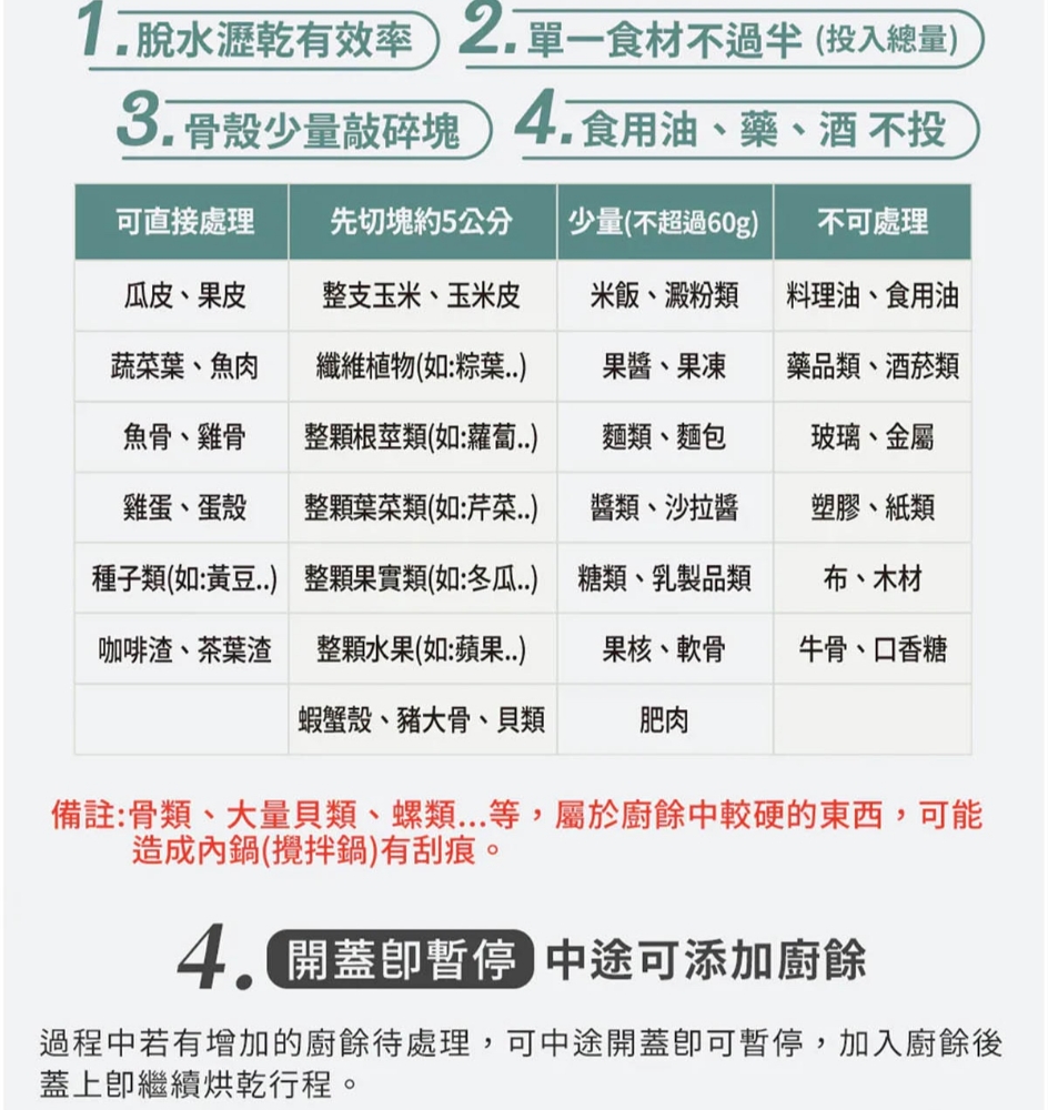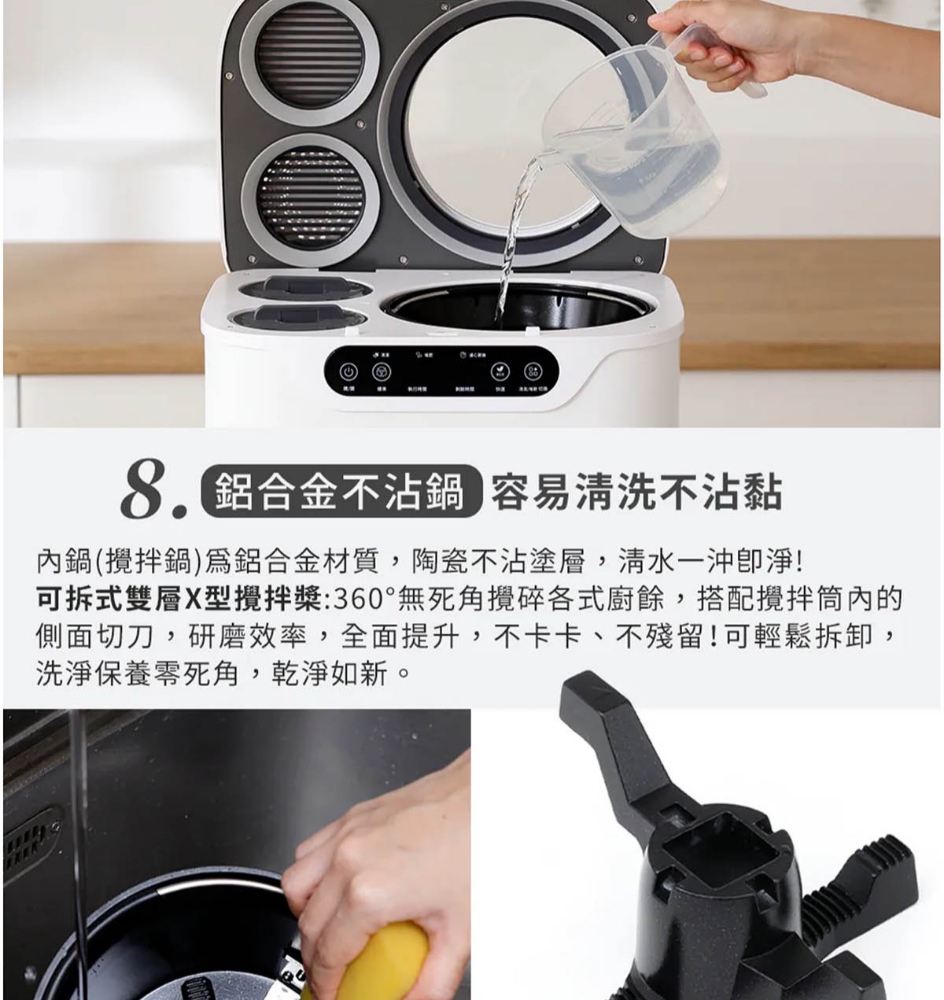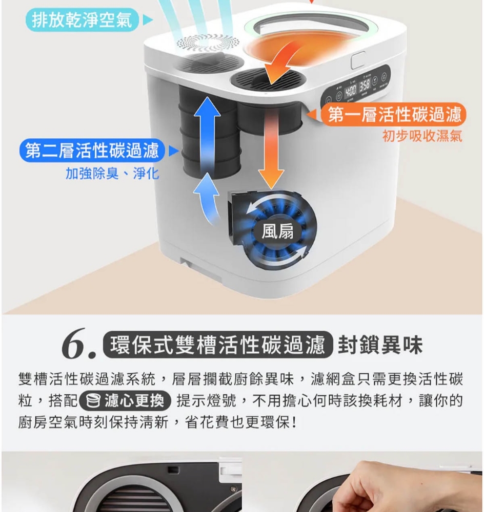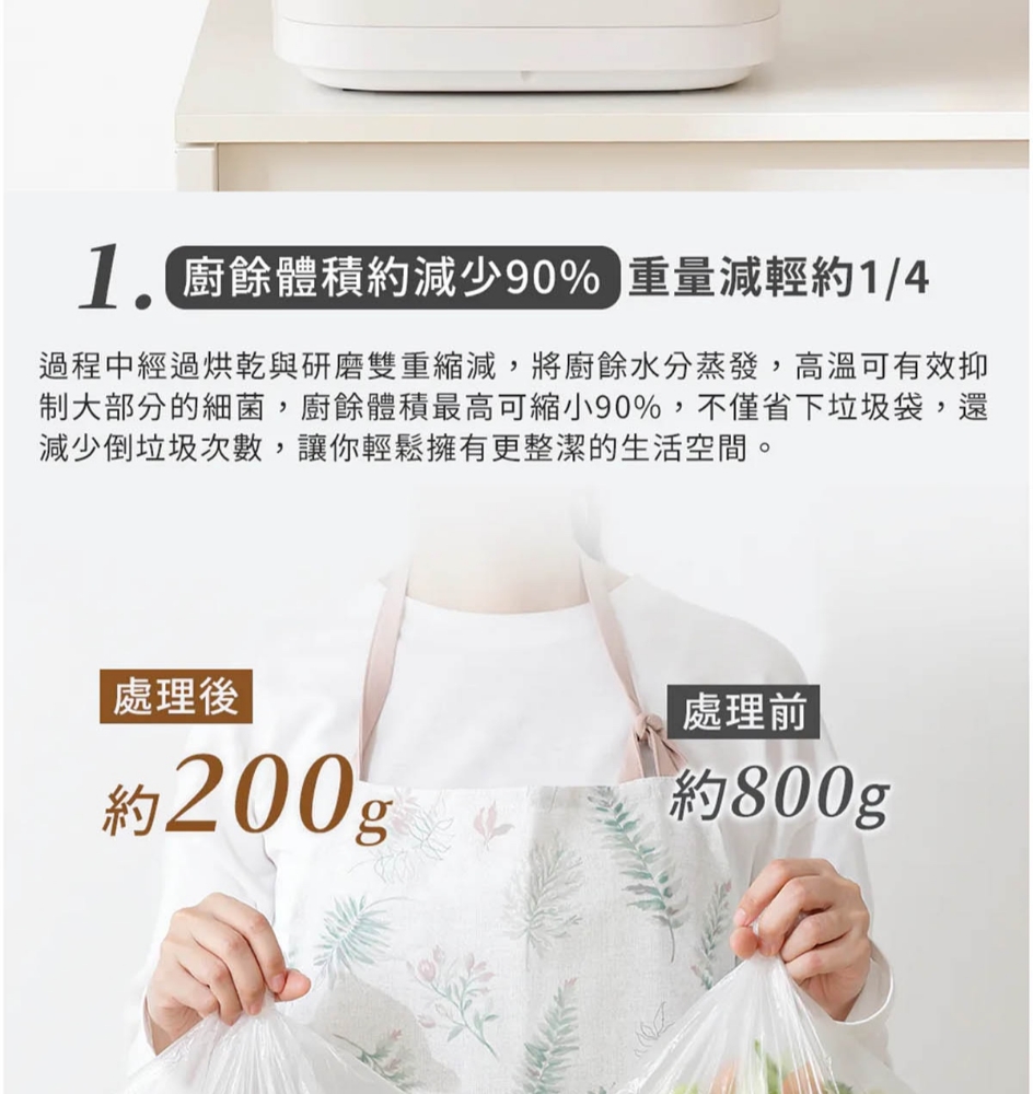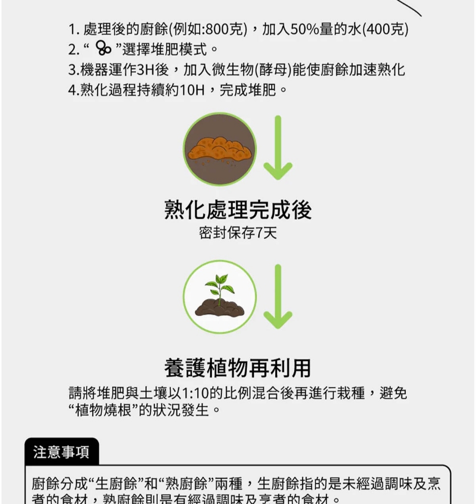 三段智慧模式可視化透明上蓋環保式雙槽活性碳過濾產品型號:GP-KW02產品顏色:白色額定電壓:AC 110V/60Hz額定功率:500W乾燥溫度:約100度內桶容量:3.8L處理容量:最大3.8L或1.9Kg運作時間:標準模式4,5,6小時 快速模式1,2,3小時 清潔時間30分鐘 推肥時間10小時產品淨重:11.3Kg產品尺寸:345*293*335mm產品內容物:主機*1/內鍋(攪拌鍋)*1/大濾心*1/小濾心*1/活性碳包*1/說明書*