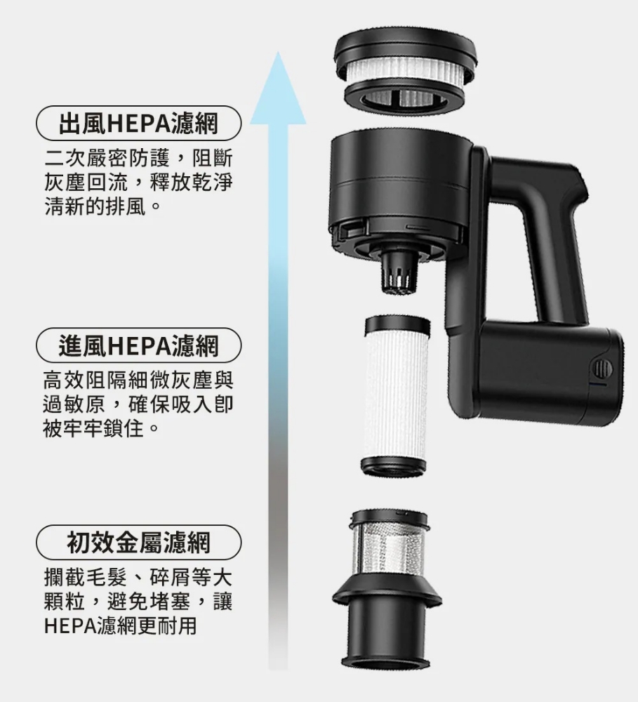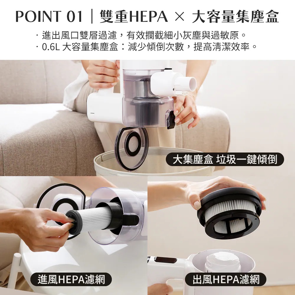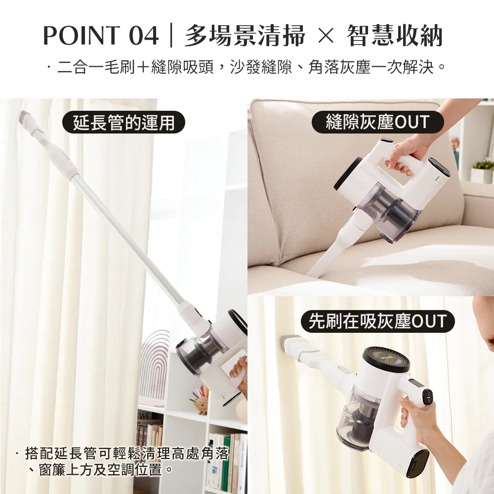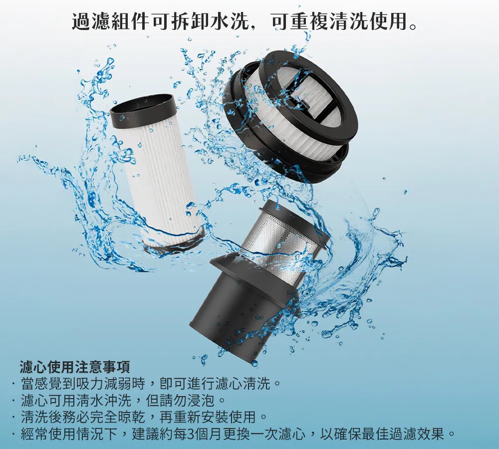 .旋風集塵,提高集塵效率,讓灰塵不容易堵塞吸塵管 .組合式吸頭(LED絨毛地刷、二合一毛刷、縫隙) .LED絨毛地刷吸頭,幫助照亮陰暗角落 .電池續航,低速模式約40分鐘,高速模式約15分鐘 .牆面掛架收納,方便收納,不佔空間 .雙HEPA濾網有效過濾細小灰塵和過敏原,可水洗重複使用 .可獨立拆卸電池充電,更換和充電更加靈活。 .LED電力顯示,可隨時看到剩餘電量,避免清潔中途沒電 .機身可站立設計,暫停清潔時可隨手停放 .0.6L大集塵盒,減少清空次數