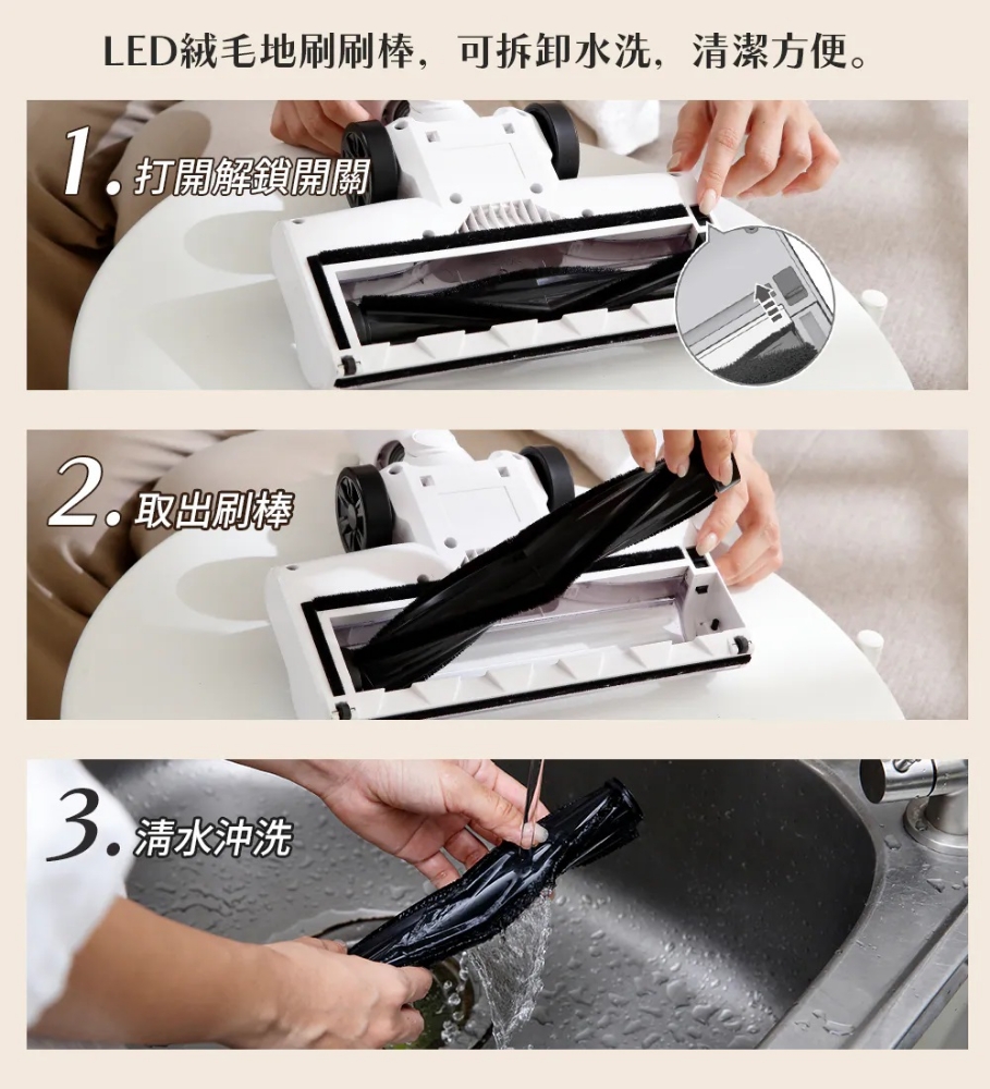 產品內容:主機*1/LED絨毛地刷吸頭*1/延長鋁管*1/二合一毛刷吸頭*1/縫隙吸頭*1/牆面掛架(含螺絲)*1/變壓器*1說明書*1