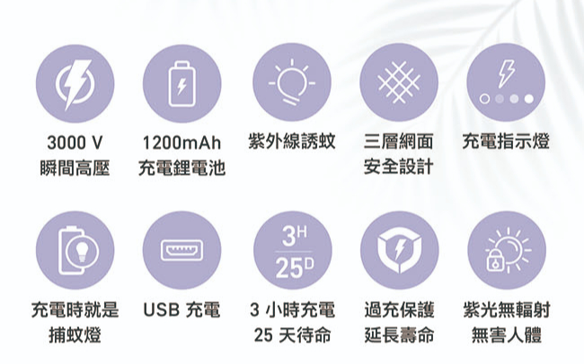 充 電 電 壓/頻 率:AC100V-240V/50-60Hz額 定 電 壓/功 率:3.7V/1W工 作 瞬 間 電 壓:3000V輸入電流/電 壓:600 mA/DC 5V紫外線波長:360-400nm 純物理光波,無輻射,對人體無害電池容量:1200mAh ( 18650 鋰電池 )