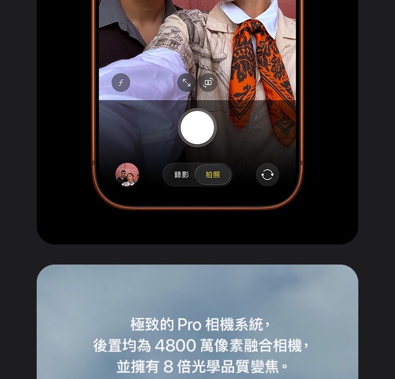 4800 萬像素融合望遠:100 公釐 (4 倍)、ƒ/2.8 光圈、Hybrid Focus Pixels、3D 感光元件位移式光學影像穩定功能與自動對焦、四重反射稜鏡設計