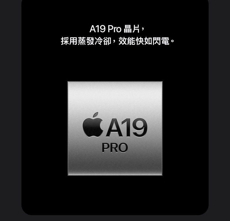鋁金屬一體成型 超瓷晶盾 6.3 吋 超 Retina XDR 顯示器 A19 Pro 晶片 自動適應更新頻率最高達 120Hz