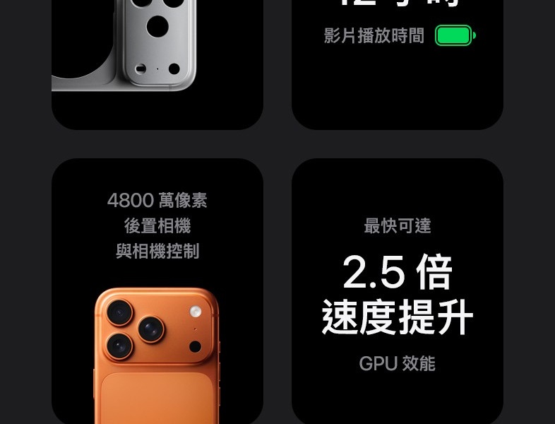 容量: 512GB 尺寸: 高度:163.4 公釐/寬度:78.0 公釐/厚度:8.75 公釐 重量:231 公克 顯示器: 超 Retina XDR 顯示器 6.9 吋 (對角線) 全螢幕 OLED 顯示器 2868 x 1320 像素,460 ppi 解析度 動態島 永遠顯示 ProMotion 技術,支援最高達 120Hz 自動適應更新頻率 HDR 顯示 原彩顯示 廣色域 (P3) 觸覺回饋觸控 2,000,000:1 對比度 (標準) 1000 尼特最大亮度 (標準);1600 尼特峰值亮度 (HDR);3000 尼特峰值亮度 (室外);1 尼特最低亮度 防指印疏油外膜 抗反射鍍膜 支援同時顯示多種語言文字 晶片: A19 Pro 晶片 6 核心 CPU 配備 2 個效能核心與 4 個節能核心 6 核心 GPU 配備神經網路加速器 16 核心神經網路引擎 硬體加速光線追蹤 相機: 4800 萬像素 Pro 融合相機系統 4800 萬像素融合主相機:24 公釐、ƒ/1.78 光圈、第 2 代感光元件位移式光學影像穩定功能、100% Focus Pixels,支援超高解析度照片 (2400 萬像素與 4800 萬像素) 同時支援 1200 萬像素光學品質 2 倍望遠:48 公釐、ƒ/1.78 光圈、第 2 代感光元件位移式光學影像穩定功能、100% Focus Pixels 4800 萬像素融合超廣角:13 公釐、ƒ/2.2 光圈與 120° 視角、Hybrid Focus Pixels、超高解析度照片 (4800 萬像素) 4800 萬像素融合望遠:100 公釐 (4 倍)、ƒ/2.8 光圈、Hybrid Focus Pixels、3D 感光元件位移式光學影像穩定功能與自動對焦、四重反射稜鏡設計 同時支援 1200 萬像素光學品質 8 倍望遠:200 公釐、ƒ/2.8 光圈、Hybrid Focus Pixels、3D 感光元件位移式光學影像穩定功能與自動對焦、四重反射稜鏡設計 8 倍光學變焦放大,2 倍光學變焦縮小;16 倍光學變焦範圍 最高可達 40 倍數位變焦 可自訂的預設鏡頭 (融合主相機) 藍寶石玻璃保護鏡 適應性原彩閃光燈 光像引擎 深度融合 智慧型 HDR 5 前置相機: 1800 萬像素 Center Stage 相機 Retina 閃光燈 點一下縮放和旋轉 拍照人物居中 超穩定錄影 智慧型 HDR 5 人像光線具備六種效果 Animoji 與 Memoji 夜間模式 空間音訊與立體聲錄音 降低風切聲 混音功能 作業系統:iOS 26 |