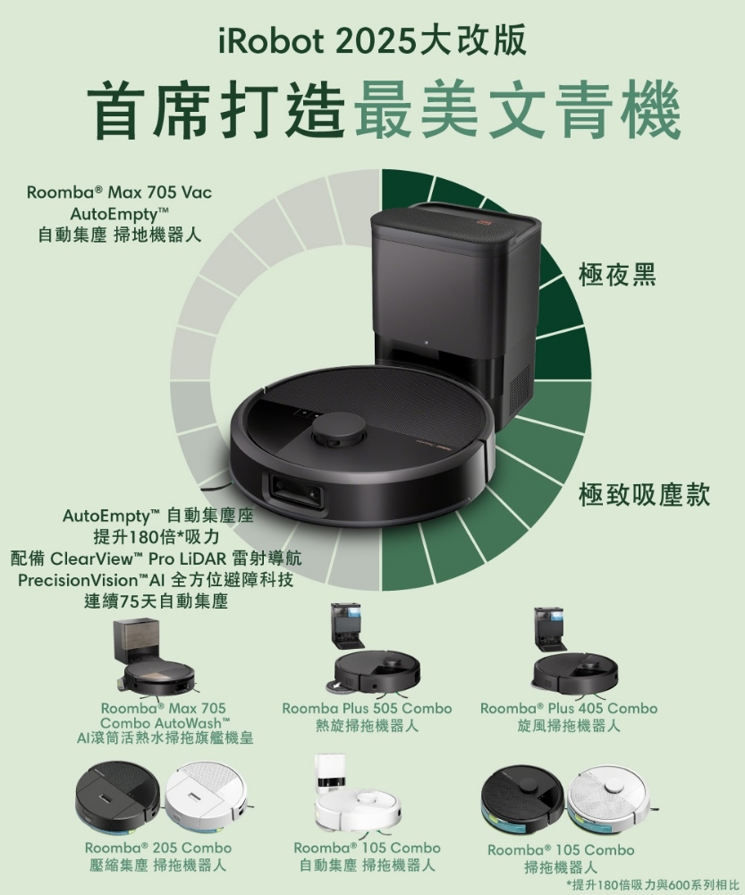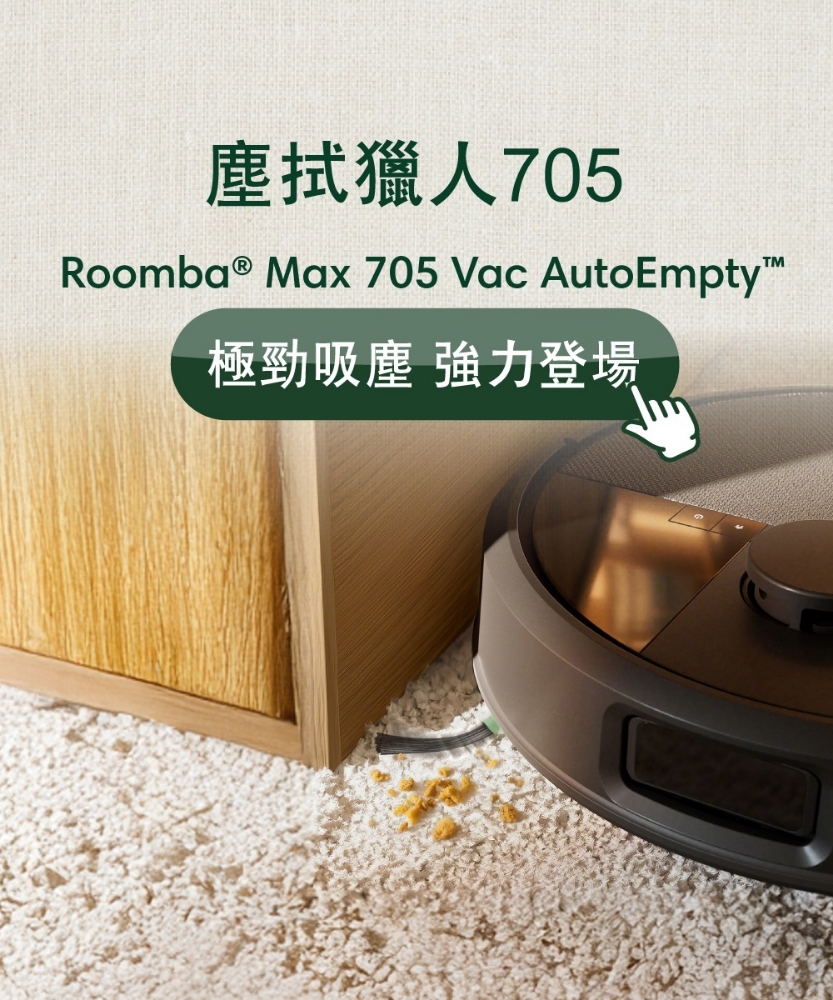 品牌:iRobot 型號:Roomba Max 705 Vac 機器人主機尺寸:35.5 (深) x 35 (寬) x 10.4 (高) 充電座尺寸(cm):21.3 (寬) x 17.1 (深) x 28.1 (高) 產品重量 (kg):主機2.9kg / 充電座1.6kg 電池 (Type, mAh):LFP,5000mAH BSMI:R37826 NCC:CCAK23Y10060T2