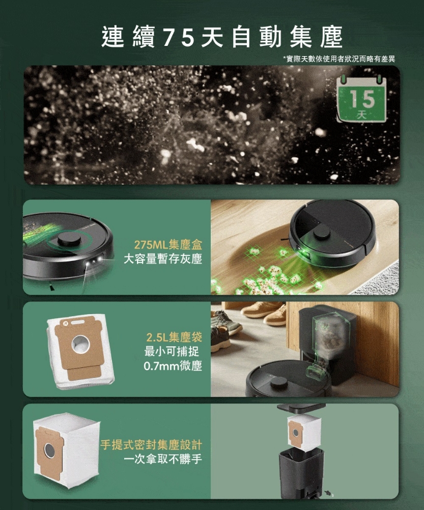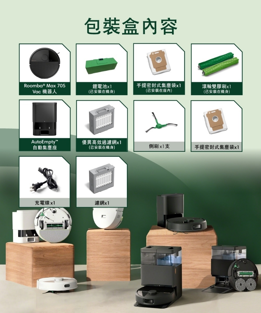 iRobot原廠標準配件: 1.Roomba Max 705 Vac 主機1台 2.原廠磷酸鐵鯉池1顆(已安裝於機身上) 3.原廠側刷1支 4.原廠主刷2支(已安裝於機身上) 5.原廠集塵盒(已安裝於機身上 內含一片原廠高效率過濾網) 6.原廠自動集塵充電塔1個(內含110V變壓器) 7.原廠電線1條 8.原廠集塵袋2個(已安裝放置於塔內) 9.原廠備用濾網1片