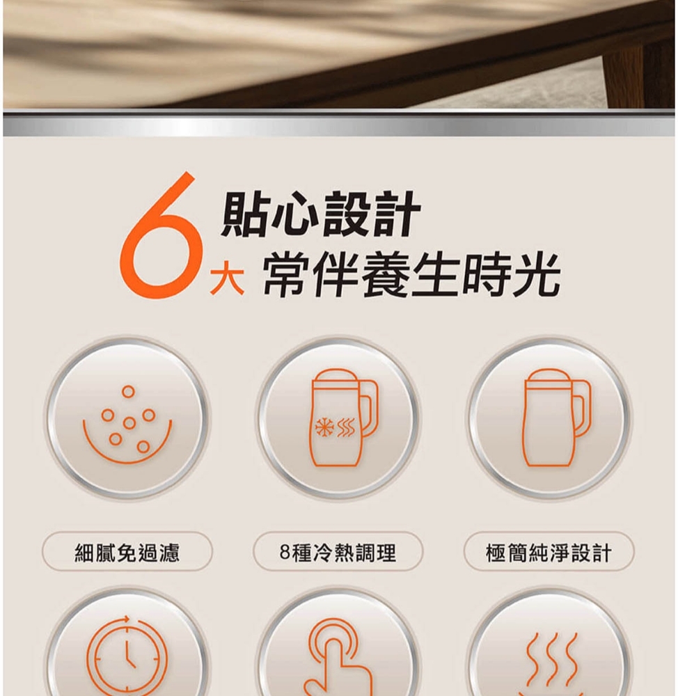 .八大冷熱功能 .獨特精磨技術 .細膩免過濾 .10H智能預約 .安全雙層防燙 .觸碰操作面板 .1.2L大容量