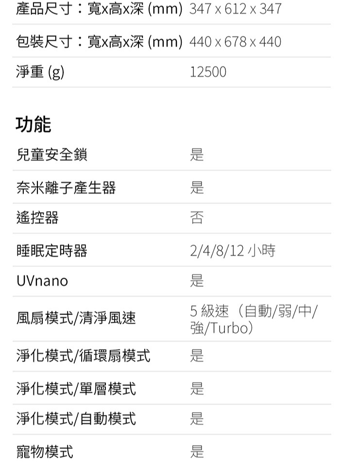 風扇模式 / 清淨風速:5 級速(自動/弱/中/強/Turbo)