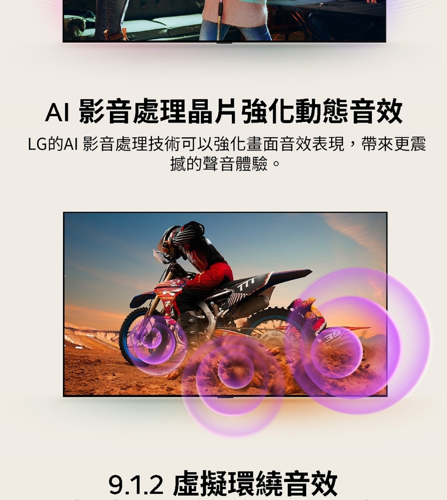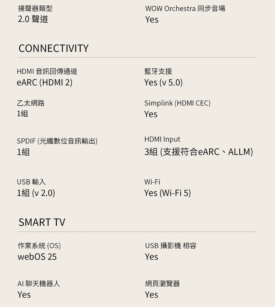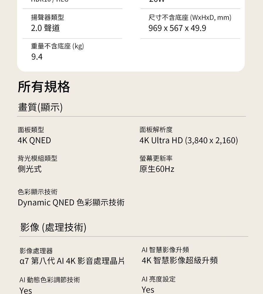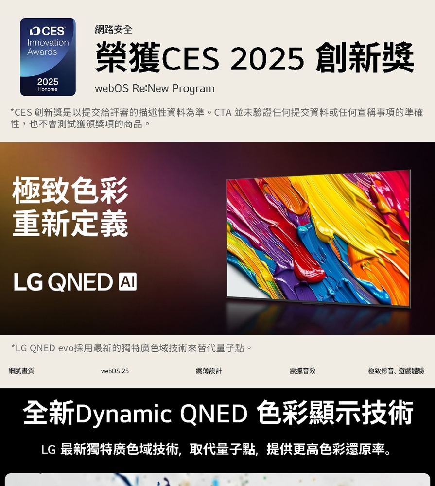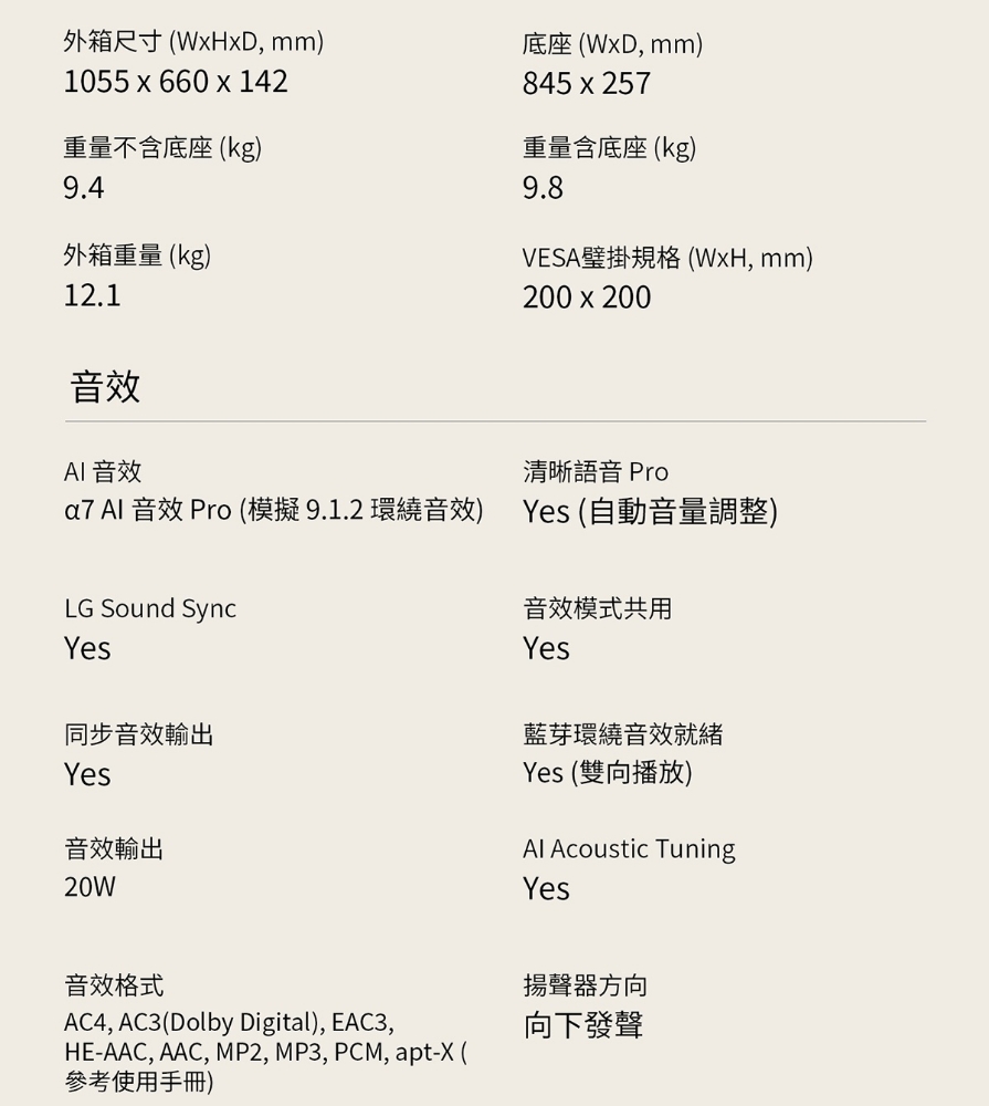 全新動態 QNED Color | 提供更豐富飽滿的色彩表現 區域控光技術 | 畫面色彩準確、減少光暈,呈現最細膩的細節 全新AI智慧滑鼠遙控器 | 透過AI 搜尋、聲紋辨識、語音控制更便利 4K Ultra HD (3,840 x 2,160) Dynamic QNED 色彩顯示技術 影像 (處理技術) 影像處理器 α7 第八代 AI 4K 影音處理晶片 AI 智慧影像升頻4K 智慧影像超級升頻 AI 動態色彩調節技術 YesAI 亮度設定 Yes HDR (高動態範圍) HDR10 / HLG 影像模式 10 種模式 自動校準 YesHGIG Mode Yes 遊戲最佳化 Yes (遊戲選單) ALLM (自動低延遲模式) Yes VRR (可變更新率) Yes (提升至 60Hz) 高對比 Yes灰階影像 Yes反轉色彩 Yes 尺寸不含底座 (WxHxD, mm)969 x 567 x 49.9 尺寸含底座 (WxHxD, mm) 969 x 634 x 257 重量含底座 (kg) 9.8 VESA璧掛規格 (WxH, mm) 200 x 200 α7 AI 音效 Pro (模擬 9.1.2 環繞音效) 音效模式共用 Yes 同步音效輸出 Yes 藍芽環繞音效就緒 Yes (雙向播放) 音效輸出 20W AI Acoustic Tuning Yes AC4, AC3(Dolby Digital), EAC3, HE-AAC, AAC, MP2, MP3, PCM, apt-X (參考使用手冊) 揚聲器類型2.0 聲道 HDMI 音訊回傳通道 eARC (HDMI 2) 藍牙支援 Yes (v 5.0) 乙太網路 1組 Simplink (HDMI CEC) Yes SPDIF (光纖數位音訊輸出) 1組 HDMI Input 3組 (支援符合eARC、ALLM) USB 輸入 1組 (v 2.0 Wi-Fi Yes (Wi-Fi 5) AI 聊天機器人YesAI 智慧語音功能 Yes 手機遙控App Yes (LG ThinQ) 聲紋辨識(語音ID) Yes 支援 Apple Airplay Yes支援 Apple Home Yes 遙控器AI 智慧滑鼠遙控器 |
